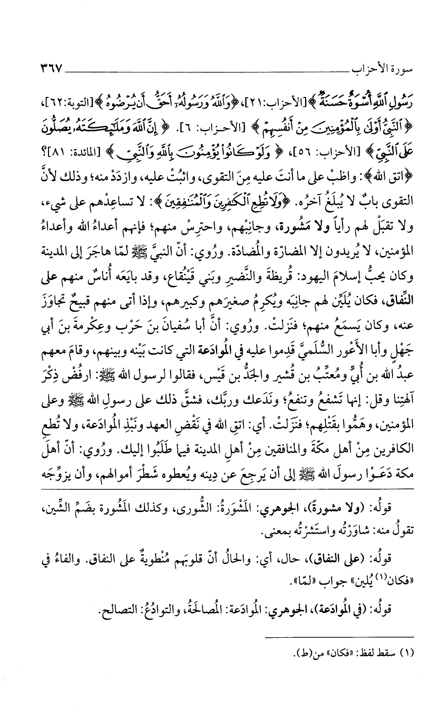 رَسُولِ الله أُسْوَةٌ حَسَنَةٌ)] الأحزاب: 21 [، (وَالله وَرَسُولُهُ أَحَقُّ أَنْ يُرْضُوهُ)] التوبة: 62 [، (النَّبِيُّ أَوْلى بِالْمُؤْمِنِينَ مِنْ أَنْفُسِهِمْ)] الأحزاب: 6 [. (إِنَّ الله وَمَلائِكَتَهُ يُصَلُّونَ عَلَى النَّبِيِّ)] الأحزاب: 56 [، (وَلَوْ كانُوا يُؤْمِنُونَ بِالله وَالنَّبِيِّ)] المائدة: 81 [؟ (اتق الله): واظب على ما أنت عليه من التقوى، واثبت عليه، وازدد منه؛ وذلك لأن التقوى باب لا يبلغ آخره. (وَلا تُطِعِ الْكافِرِينَ وَالْمُنافِقِينَ): لا تساعدهم على شيء، ولا تقبل لهم رأيًا ولا مشورة، وجانبهم، واحترس منهم؛ فإنهم أعداء الله وأعداء المؤمنين، لا يريدون إلا المضارّة والمضادّة. وروى أنّ النبي صلى الله عليه وسلم لما هاجر إلى المدينة وكان يحب إسلام اليهود: قريظة والنضير وبنى قينقاع، وقد بايعه أناس منهم على النفاق فكان يلين لهم جانبه ويكرم صغيرهم وكبيرهم، وإذا أتى منهم قبيح تجاوز عنه، وكان يسمع منهم؛ فنزلت. وروى: أن أبا سفيان بن حرب وعكرمة بن أبى جهل وأبا الأعور السلمى قدموا عليه في الموادعة التي كانت بينه وبينهم، وقام معهم عبد الله بن أبىّ ومعتب بن قشير والجد بن قيس، فقالوا للرسول الله صلى الله عليه وسلم: ارفض ذكر آلهتنا وقل: إنها تشفع وتنفع؛ وندعك وربك، فشق ذلك على رسول الله صلى الله عليه وسلم وعلى المؤمنين، وهموا بقتلهم؛ فنزلت. أى: اتق الله في نقض العهد ونبذ الموادعة، ولا تطع الكافرين من أهل مكة والمنافقين من أهل المدينة فيما طلبوا إليك. وروى: أنّ أهل مكة دعوا رسول الله صلى الله عليه وسلم إلى أن يرجع عن دينه ويعطوه شطر أموالهم، وأن يزوجه
