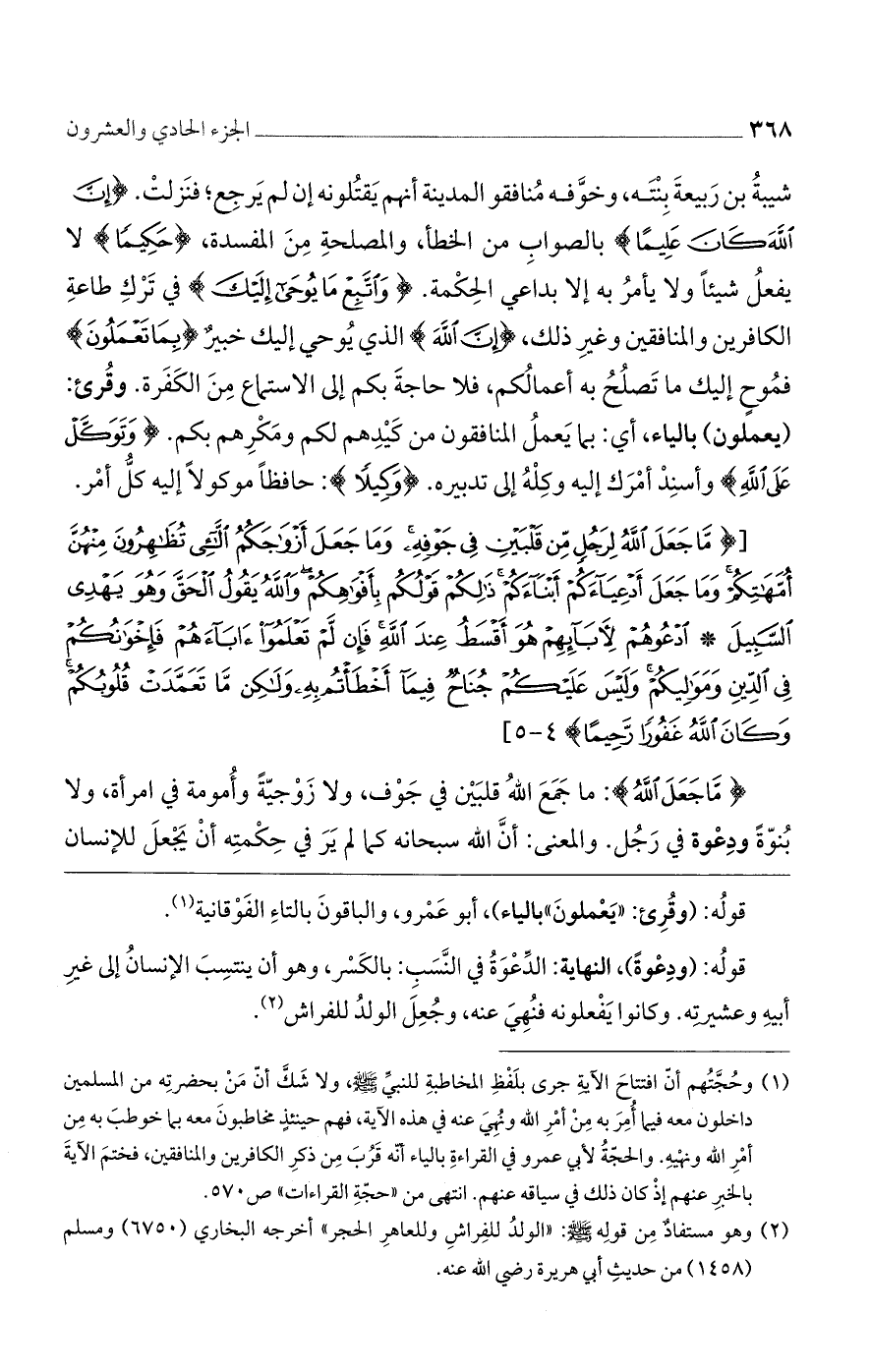 [(ما جَعَلَ الله لِرَجُلٍ مِنْ قَلْبَيْنِ فِي جَوْفِهِ وَما جَعَلَ أَزْواجَكُمُ اللاَّئِي تُظاهِرُونَ مِنْهُنَّ أُمَّهاتِكُمْ وَما جَعَلَ أَدْعِياءَكُمْ أَبْناءَكُمْ ذلِكُمْ قَوْلُكُمْ بِأَفْواهِكُمْ وَالله يَقُولُ الْحَقَّ وَهُوَ يَهْدِي السَّبِيلَ (4) ادْعُوهُمْ لِآبائِهِمْ هُوَ أَقْسَطُ عِنْدَ الله فَإِنْ لَمْ تَعْلَمُوا آباءَهُمْ فَإِخْوانُكُمْ فِي الدِّينِ وَمَوالِيكُمْ وَلَيْسَ عَلَيْكُمْ جُناحٌ فِيما أَخْطَاتُمْ بِهِ وَلكِنْ ما تَعَمَّدَتْ قُلُوبُكُمْ وَكانَ الله غَفُوراً رَحِيماً)] 4 - 5 [