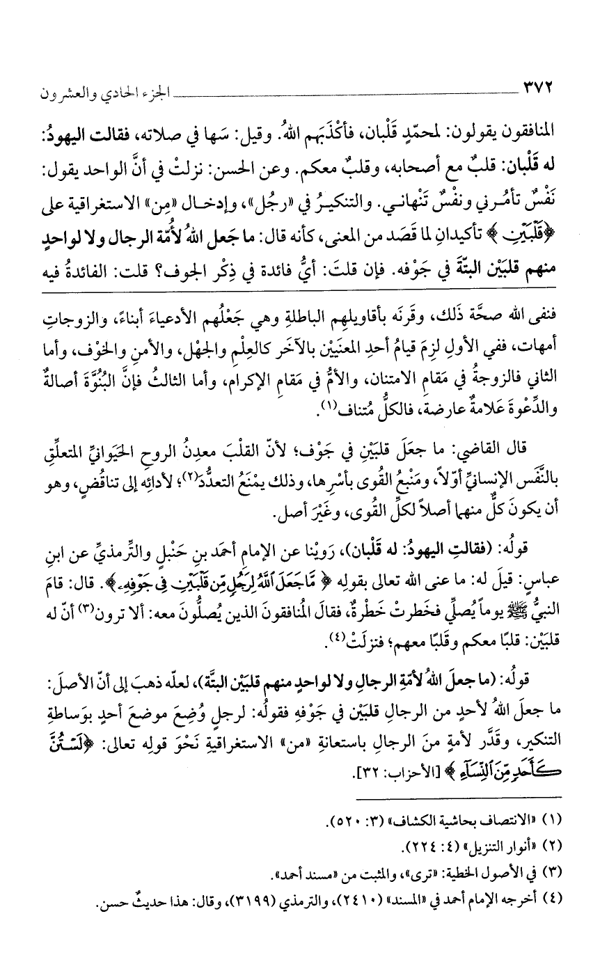 قولُه: (ما جعلَ اللهُ لأمّةِ الرجالِ ولا لواحدٍ منهم قلبَيْن البتَّة)، لعلّه ذهبَ إلى أنّ الأصلَ: ما جعلَ اللهُ لأحدٍ من الرجالِ قلبَيْن في جَوْفِه فقولُه: لرجلٍ وُضِعَ موضعَ أحدٍ بوَساطةِ التنكير، وقَدَّر لأمةٍ منَ الرجالِ باستعانةِ ((من)) الاستغراقيةِ نَحْوَ قولِه تعالى: {لَسْتُنَّ كَأَحَدٍ مِّنَ النِّسَاءِ} [الأحزاب: 32].