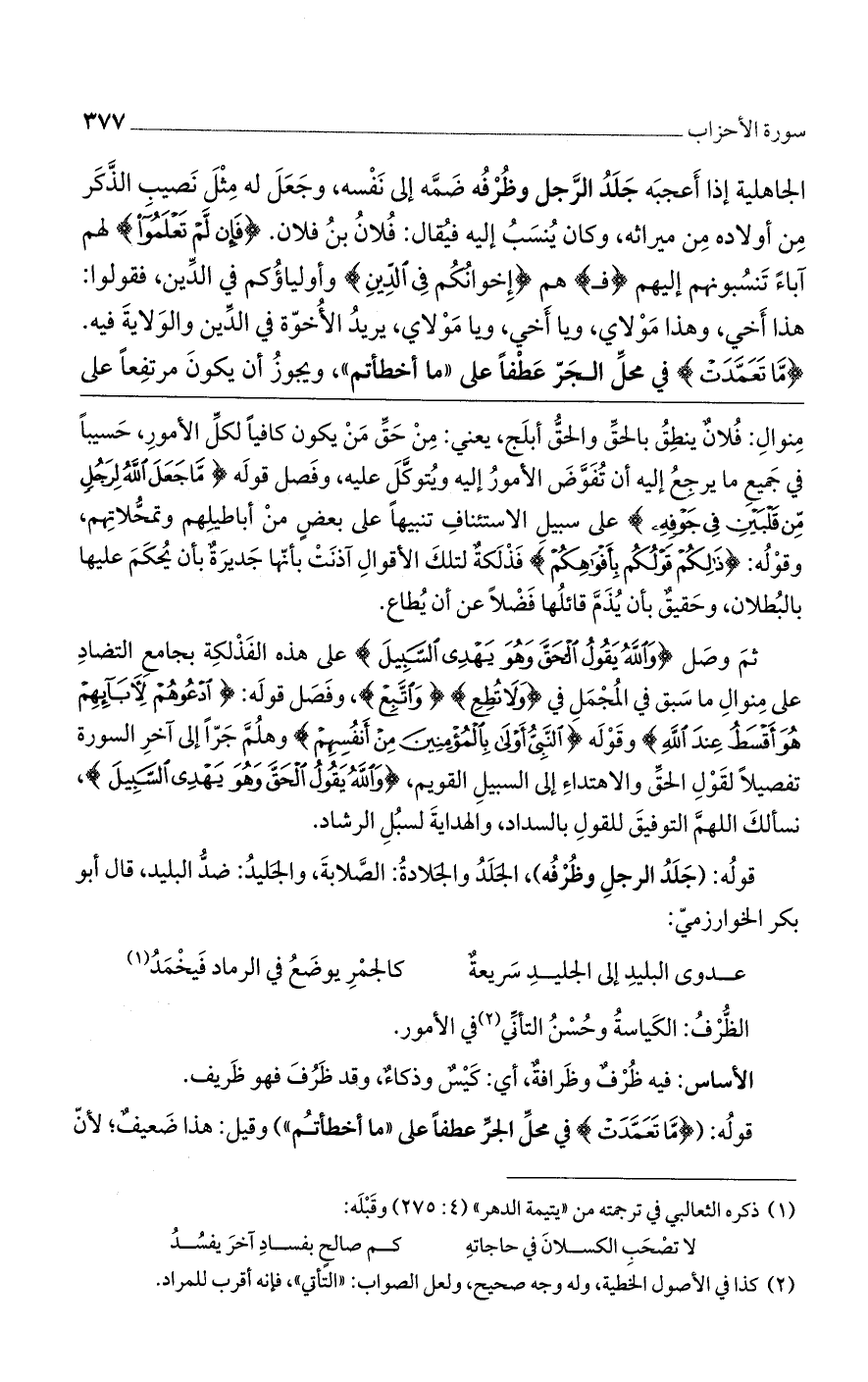 الجاهلية إذا أعجبه جلد الرجل وظرفه ضمه إلى نفسه، وجعل له مثل نصيب الذكر من أولاده من ميراثه، وكان ينسب إليه فيقال: فلان ابن فلان. (فَإِنْ لَمْ تَعْلَمُوا) لهم آباء تنسبونهم إليهم (فـ) هم (إِخْوانُكُمْ فِي الدِّينِ) وأولياؤكم في الدين، فقولوا: هذا أخى، وهذا مولاي، ويا أخى، ويا مولاي، يريد الأخوّة في الدين والولاية فيه. (ما تَعَمَّدَتْ) في محل الجرّ عطفا على "ما أخطأتم"، ويجوز أن يكون مرتفعًا على
