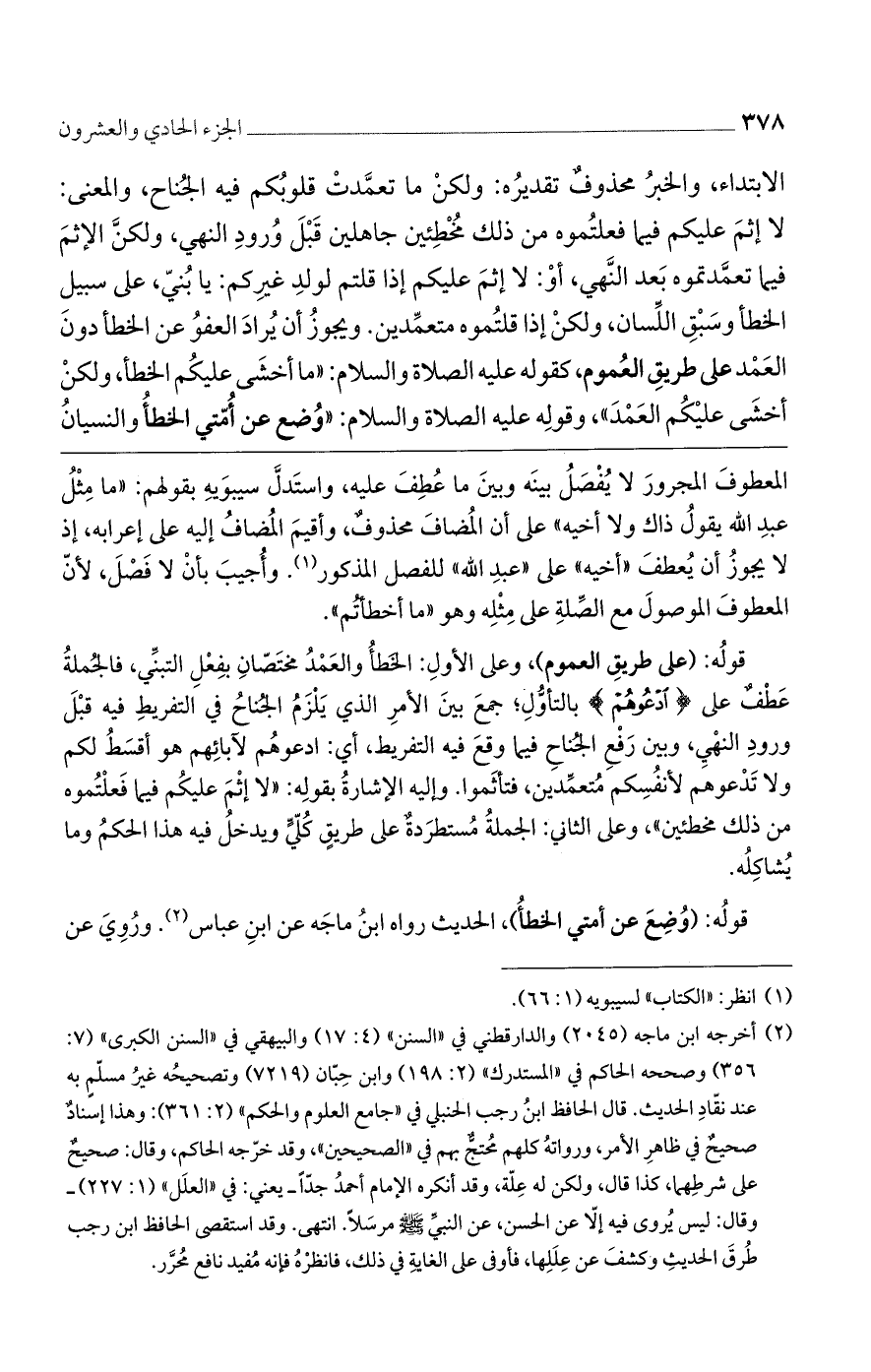 قولُه: (على طريقِ العموم)، وعلى الأولِ: الخَطأُ والعَمْدُ مختَصّانِ بفِعْلِ التبنِّي، فالجُملةُ عَطْفٌ على {ادْعُوهُمْ} بالتأوُّلِ؛ جمعَ بينَ الأمرِ الذي يَلْزَمُ الجُناحُ في التفريطِ فيه قبْلَ ورودِ النهْيِ، وبين رَفْعِ الجُناحِ فيما وقعَ فيه التفريط، أي: ادعوهُم لآبائِهم هو أقسَطُ لكم ولا تَدْعوهم لأنفُسِكم مُتعِّدين، فتأثَموا. وإليه الإشارةُ بقولِه: ((لا إثْمَ عليكُم فيما فَعلْتُموه من ذلك مخطئين))، وعلى الثاني: الجملةُ مُستطرَدةٌ على طريقٍ كُلّيٍّ ويدخلُ فيه هذا الحكمُ وما يُشاكِلُه.