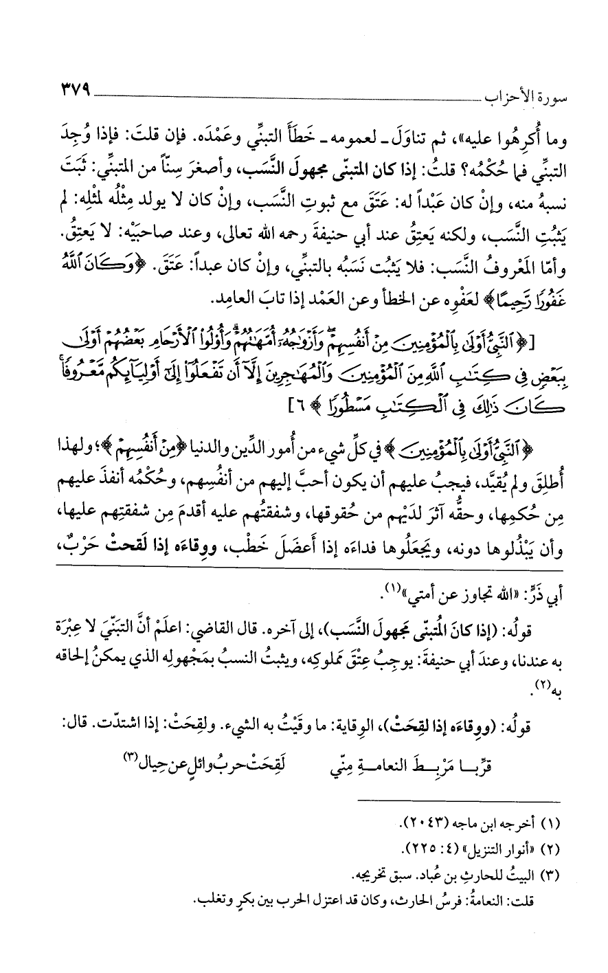 [(النَّبِيُّ أَوْلى بِالْمُؤْمِنِينَ مِنْ أَنْفُسِهِمْ وَأَزْواجُهُ أُمَّهاتُهُمْ وَأُولُوا الْأَرْحامِ بَعْضُهُمْ أَوْلى بِبَعْضٍ فِي كِتابِ الله مِنَ الْمُؤْمِنِينَ وَالْمُهاجِرِينَ إِلاَّ أَنْ تَفْعَلُوا إِلى أَوْلِيائِكُمْ مَعْرُوفاً كانَ ذلِكَ فِي الْكِتابِ مَسْطُوراً)] 6 [