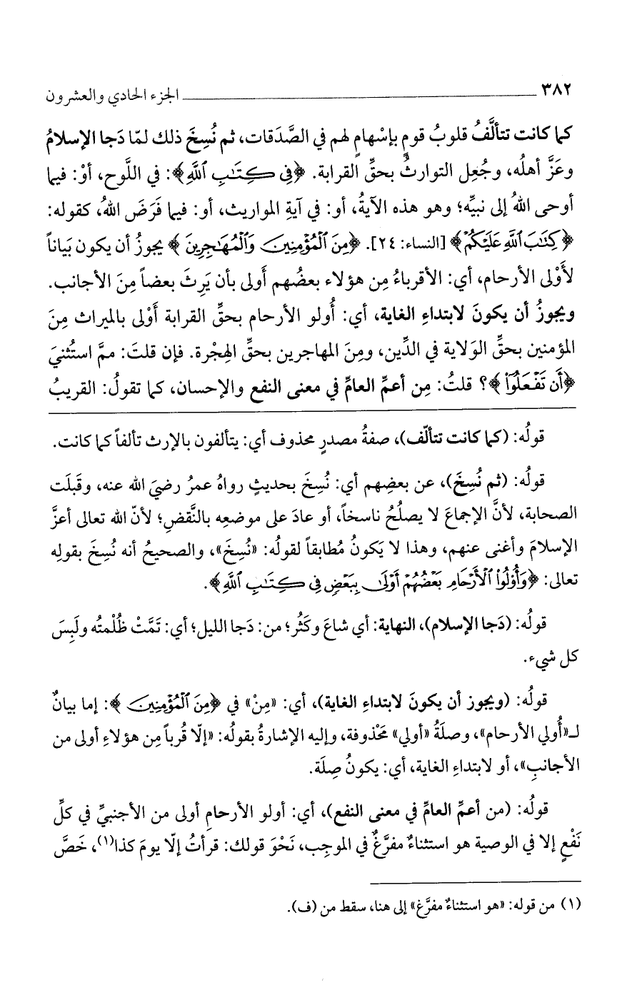 قولُه: (كما كانت تتألّف)، صفةُ مصدرٍ محذوف أي: يتألفون بالإرث تألفًا كما كانت.