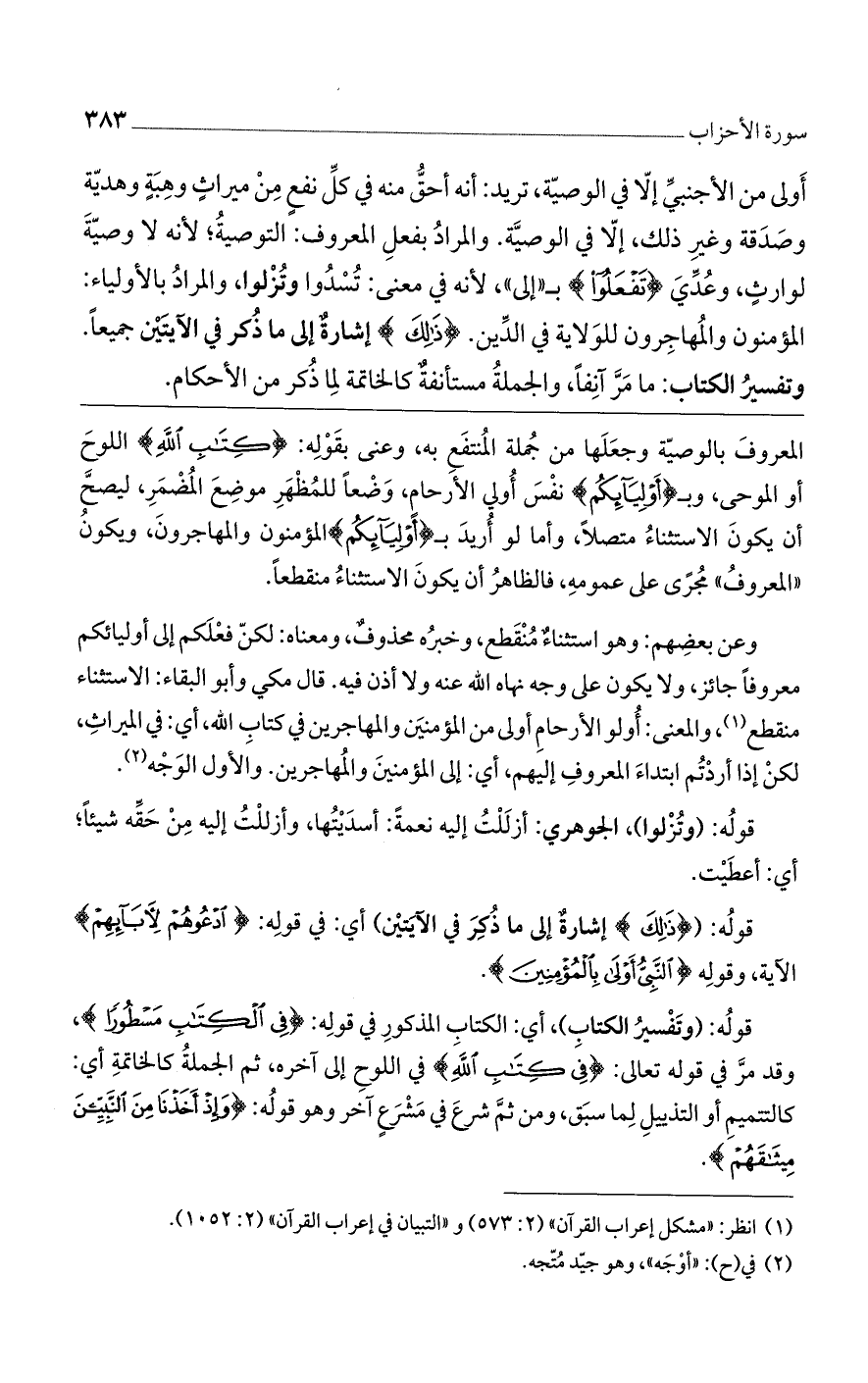 المعروفَ بالوصيّة وجعَلَها من جُملة المُنتفَعِ به، وعنى بقَوْلِه: {كِتَابِ اللَّهِ} اللوحَ أو الموحى، وبـ {أَوْلِيَائِكُم} نفْسَ أُولي الأرحام، وَضْعًا للمُظْهَرِ موضِعَ المُضْمَرِ، ليصحَّ أن يكونَ الاستثناءُ متصلاً، وأما لو أُريدَ بـ {أَوْلِيَائِكُم} المؤمنون والمهاجرونَ، ويكونُ ((المعروفُ)) مُجرًى على عمومهِ، فالظاهرُ أن يكونَ الاستثناءُ منقطعًا.