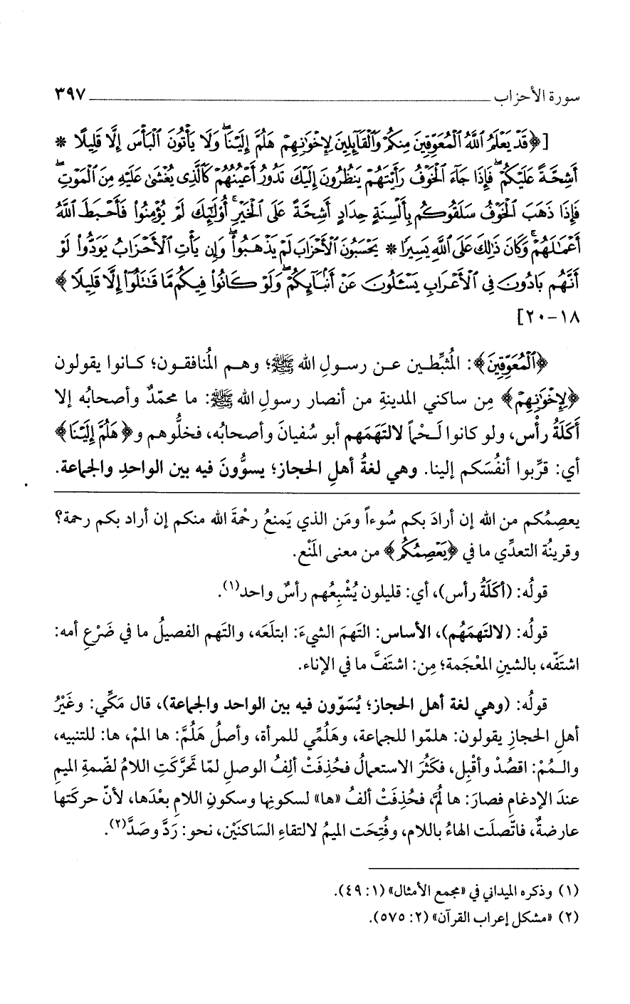 (الْمُعَوِّقِينَ): المثبطين عن رسول الله صلى الله عليه وسلم وهم المنافقون؛ كانوا يقولون (لِإِخْوانِهِمْ) من ساكني المدينة من أنصار رسول الله صلى الله عليه وسلم: ما محمد وأصحابه إلا أكلة رأس، ولو كانوا لحمًا لالتهمهم أبو سفيان وأصحابه، فخلوهم و (هَلُمَّ إِلَيْنا) أى: قربوا أنفسكم إلينا. وهي لغة أهل الحجاز؛ يسؤون فيه بين الواحد والجماعة.
