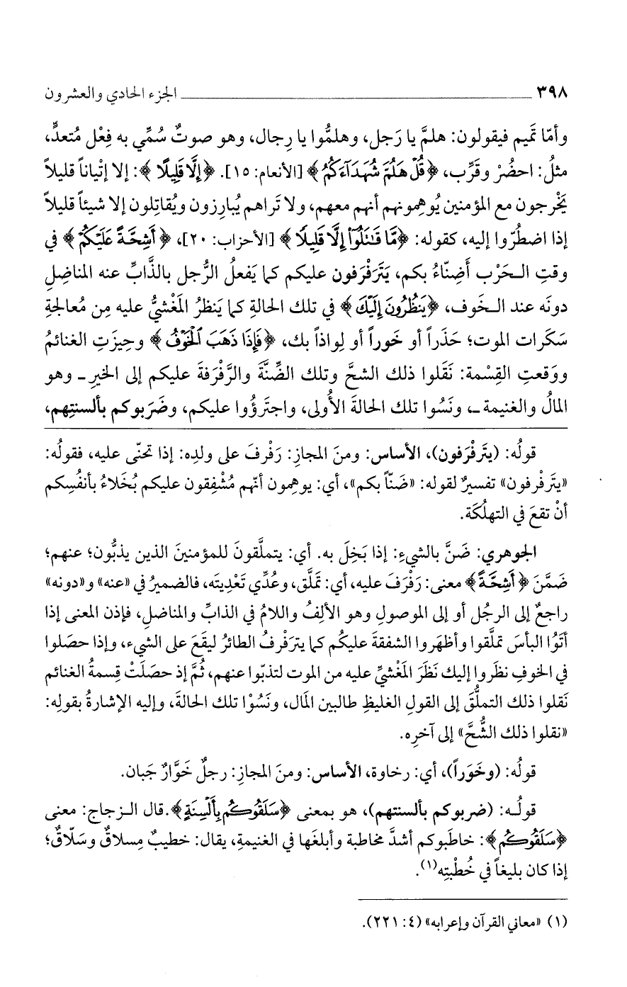 وأمّا تميم فيقولون: هلمّ يا رجل، وهلموا يا رجال، وهو صوت سمى به فعل متعدّ، مثل: احضر وقرب، (قُلْ هَلُمَّ شُهَداءَكُمُ)] الأنعام: 15 [. (إِلَّا قَلِيلًا): إلا إتيانًا قليلًا يخرجون مع المؤمنين يوهمونهم أنهم معهم، ولا نراهم يبارزون ويقاتلون إلا شيئًا قليلًا إذا اضطرّوا إليه، كقوله: (ما قاتَلُوا إِلَّا قَلِيلًا)] الأحزاب: 20 [، (أَشِحَّةً عَلَيْكُمْ) في وقت الحرب أضناء بكم، يترفرفون عليكم كما يفعل الرجل بالذاب عنه المناضل دونه عند الخوف، (يَنْظُرُونَ إِلَيْكَ) في تلك الحالة كما ينظر المغشى عليه من معالجة سكرات الموت؛ حذرًا أو خورًا ولواذًا بك، (فإذا ذهب الخوف) وحيزت الغنائم ووقعت القسمة: نقلوا ذلك الشحّ وتلك الضنة والرفرفة عليكم إلى الخير -وهو المال والغنيمة- ونسوا تلك الحالة الأولى، واجترءوا عليكم، وضربوكم بألسنتهم،