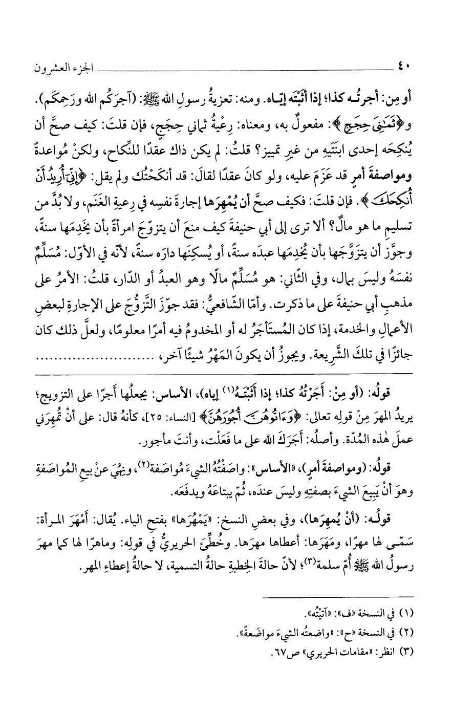قولُه: (أنْ يُمهِرَها)، وفي بعضِ النسخ: ((يَمْهُرَها)) بفتحِ الياء. يُقال: أَمْهَرَ المرأة: سَمّي لها مهرًا، ومَهَرَها: أعطاها مهرَها. وخُطّْئَ الحريريُّ في قولِه: وماهرًا لها كما مهرَ رسولُ الله صلى الله عليه وسلم أمُّ سلمة؛ لأنّ حالةَ الخِطبةِ حالةُ التسمية، لا حالةُ إعطاءِ المهر.