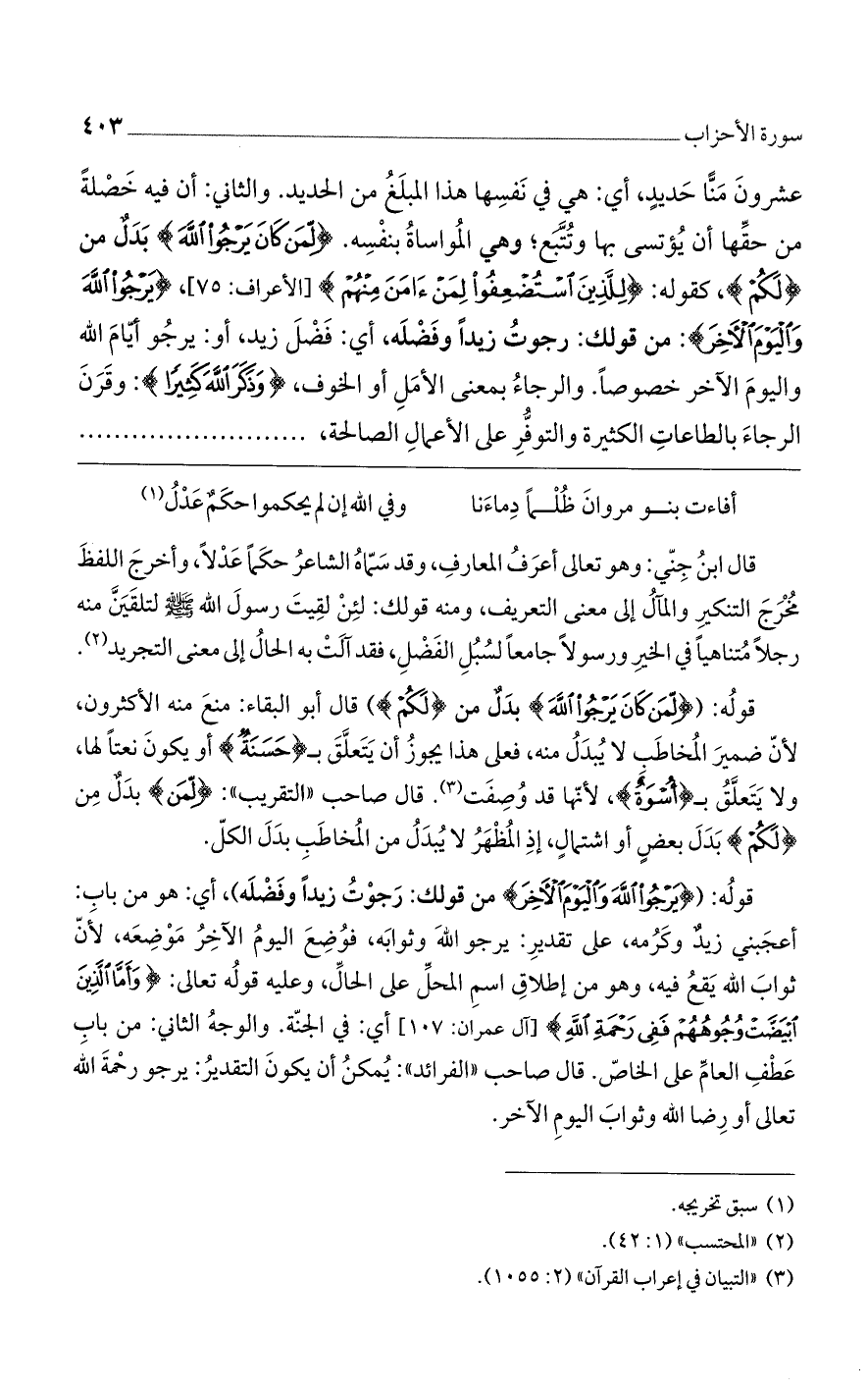 عشرون منا حديٍد، أى: هي في نفسها هذا المبلغ من الحديد. والثاني: أن فيه خصلة من حقها أن يؤتسى بها وتتبع؛ وهي المواساة بنفسه. (لِمَنْ كانَ يَرْجُوا الله) بدل من (لكم)، كقوله: (لِلَّذِينَ اسْتُضْعِفُوا لِمَنْ آمَنَ مِنْهُمْ)] الأعراف: 75 [، (يرجو الله واليوم الآخر): من قولك: رجوت زيدًا وفضله، أى: فضل زيد، أو: يرجو أيام الله واليوم الآخر خصوصًا. والرجاء بمعنى الأمل أو الخوف، (وَذَكَرَ الله كَثِيراً): وقرن الرجاء بالطاعات الكثيرة والتوفر على الأعمال الصالحة،