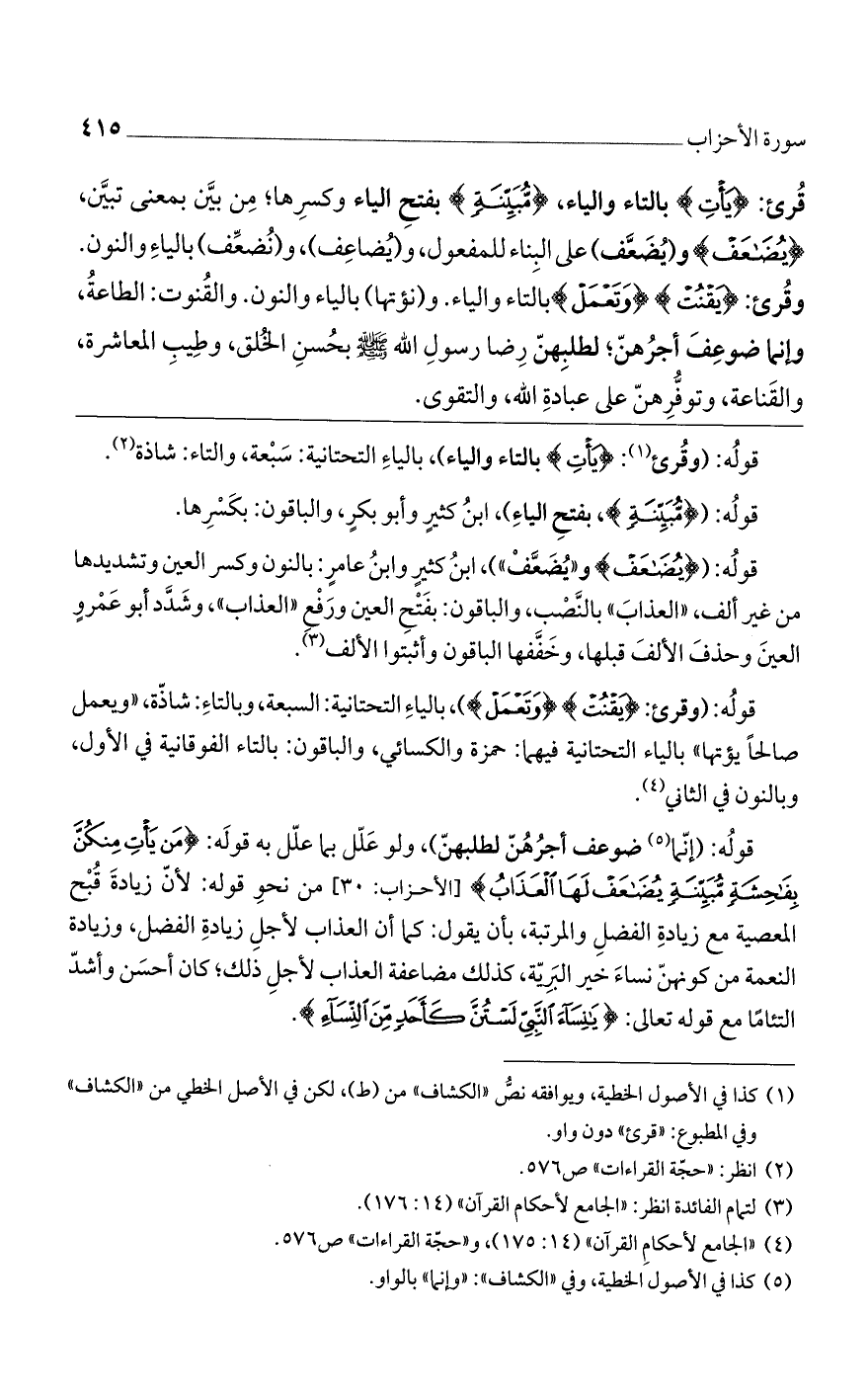قولُه: (وقرئ: {يَقْنُتْ} {وَتَعْمَلْ})، بالياءِ التحتانية: السبعة، وبالتاءِ: شاذّة، ((ويعمل صالحًا يؤتها)) بالياء التحتانية فيهما: حمزة والكسائي، والباقون: بالتاء الفوقانية في الأول، وبالنون في الثاني.