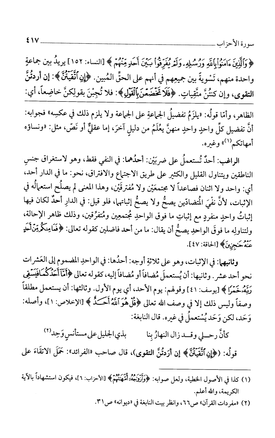 (وَالَّذِينَ آمَنُوا بِالله وَرُسُلِهِ وَلَمْ يُفَرِّقُوا بَيْنَ أَحَدٍ مِنْهُمْ)] النساء: 152 [يريد بين جماعةٍ واحدة منهم، تسوية بين جميعهم في أنهم على الحق المبين. (إِنِ اتَّقَيْتُنَّ): إن أردتن التقوى، وإن كنتن متقيات. (فَلا تَخْضَعْنَ بِالْقَوْلِ): فلا تجبن بقولكن خاضعًا، أي: