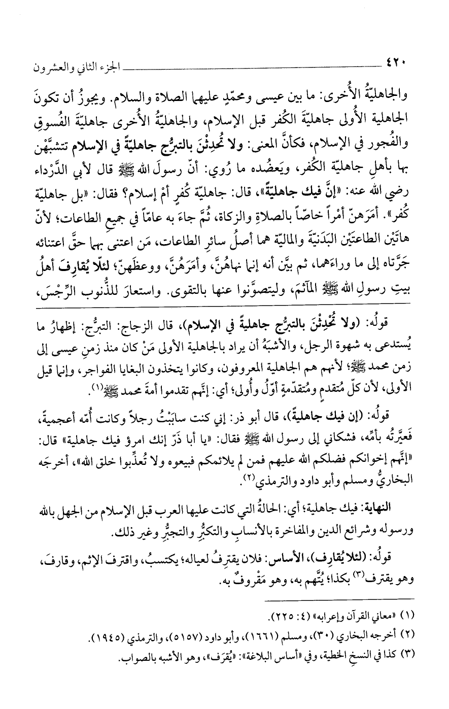 قولُه: (ولا تُحْدِثْنَ بالتبرُّج جاهليةً في الإسلام)، قال الزجاج: التبرُّج: إظهارُ ما يُستدعى به شهوة الرجل، والأشبَهُ أن يراد بالجاهلية الأولى مَنْ كان منذ زمنِ عيسى إلى زمن محمد صلى الله عليه وسلم؛ لأنهم هم الجاهلية المعروفون، وكانوا يتخذون البغايا الفواجر، وإنما قيل الأولى، لأن كلّ مُتقدمٍ ومُتقدّمةٍ أوّلُ وأُولى؛ أي: إنَّهم تقدموا أمةَ محمد صلى الله عليه وسلم.