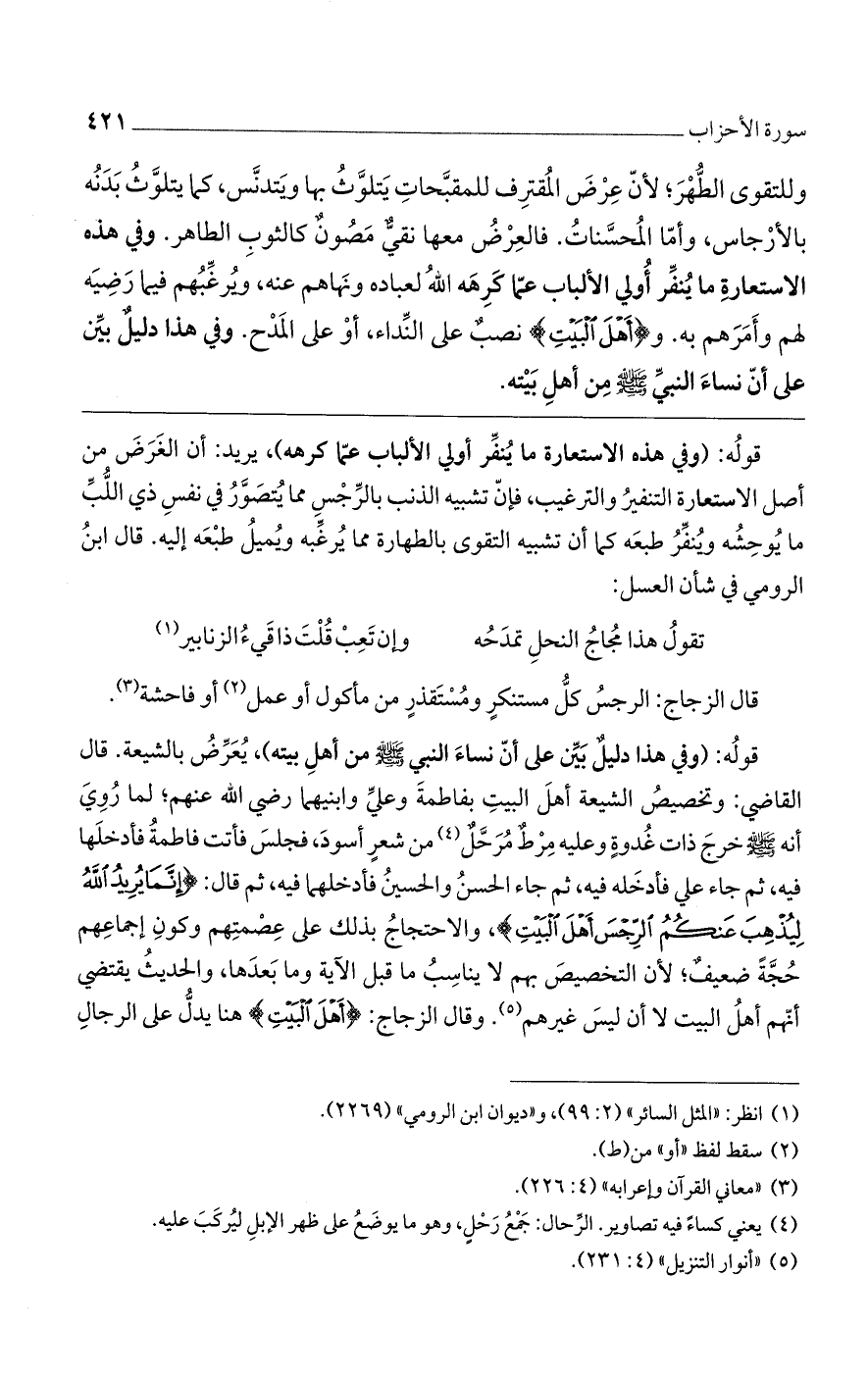 قولُه: (وفي هذا دليلٌ بَيِّن على أنّ نساءَ النبي صلى الله عليه وسلم من أهلِ بيته)، يُعَرِّضُ بالشيعة. قال القاضي: وتخصيصُ الشيعة أهلَ البيتِ بفاطمةَ وعليِّ وابنيهما رضي الله عنهم؛ لما رُوِيَ أنه صلى الله عليه وسلم خرجَ ذات غُدوةٍ وعليه مِرْطٌ مُرَحَّلٌ من شعرٍ أسودَ، فجلسَ فأتت فاطمةُ فأدخلَها فيه، ثم جاء علي فأدخَله فيه، ثم جاء الحسنُ والحسينُ فأدخلهما فيه، ثم قال: {إِنَّمَا يُرِيدُ اللَّهُ لِيُذْهِبَ عَنكُمُ الرِّجْسَ أَهْلَ الْبَيْتِ}، والاحتجاجُ بذلك على عِصْمتِهم وكونِ إجماعِهم حُجَّةً ضعيفٌ؛ لأن التخصيصَ بهم لا يناسِبُ ما قبل الآية وما بَعدَها، والحديثُ يقتضي أنّهم أهلُ البيت لا أن ليسَ غيرهم. وقال الزجاج: {أَهْلَ الْبَيْتِ} هنا يدلُّ على الرجالِ