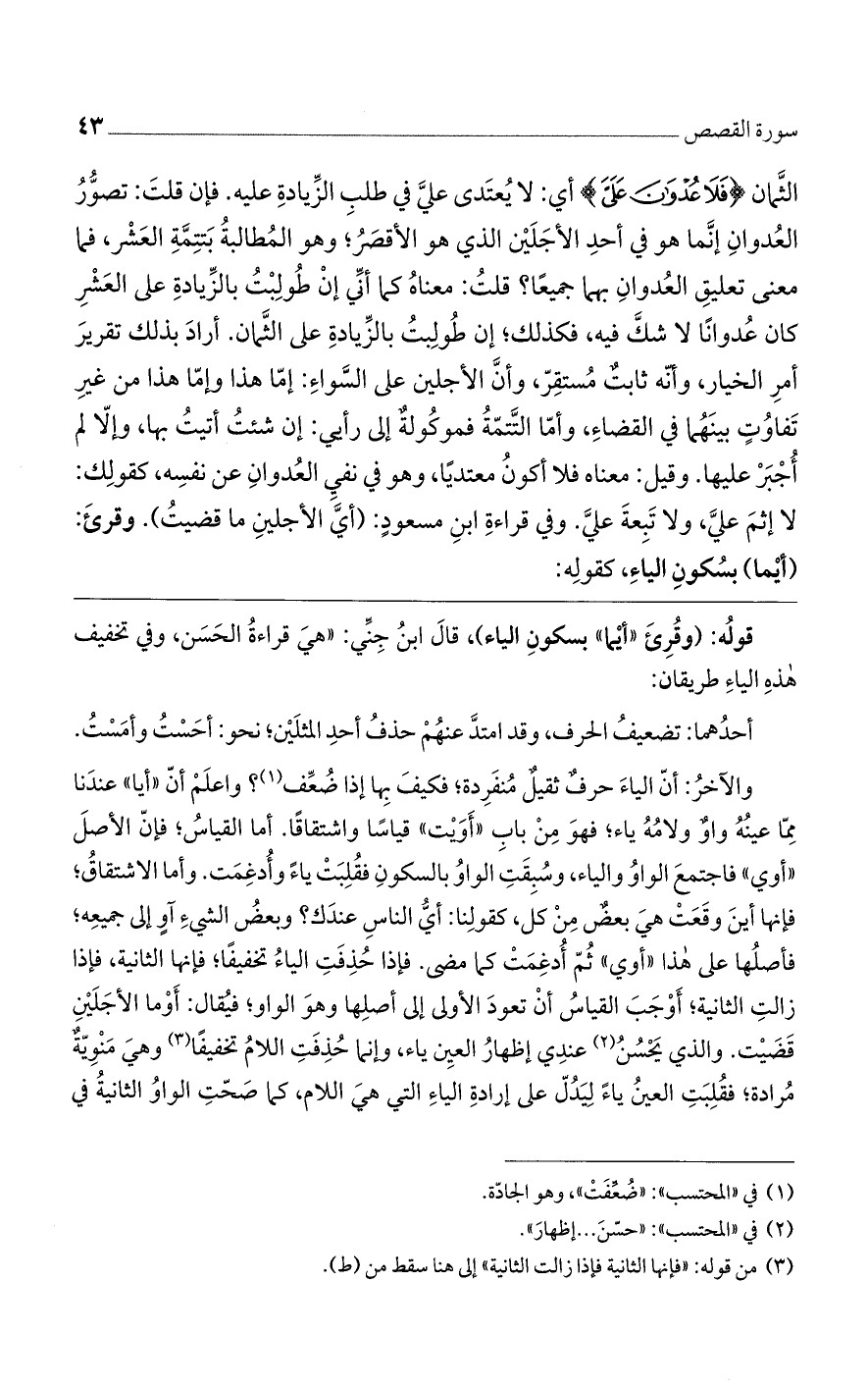 قولُه: (وقُرِئَ ((أيْما)) بسكونِ الياء)، قالَ ابنُ جِنِّي: ((هيَ قراءةُ الحَسَن، وفي تخفيف هذهِ الياءِ طريقان: