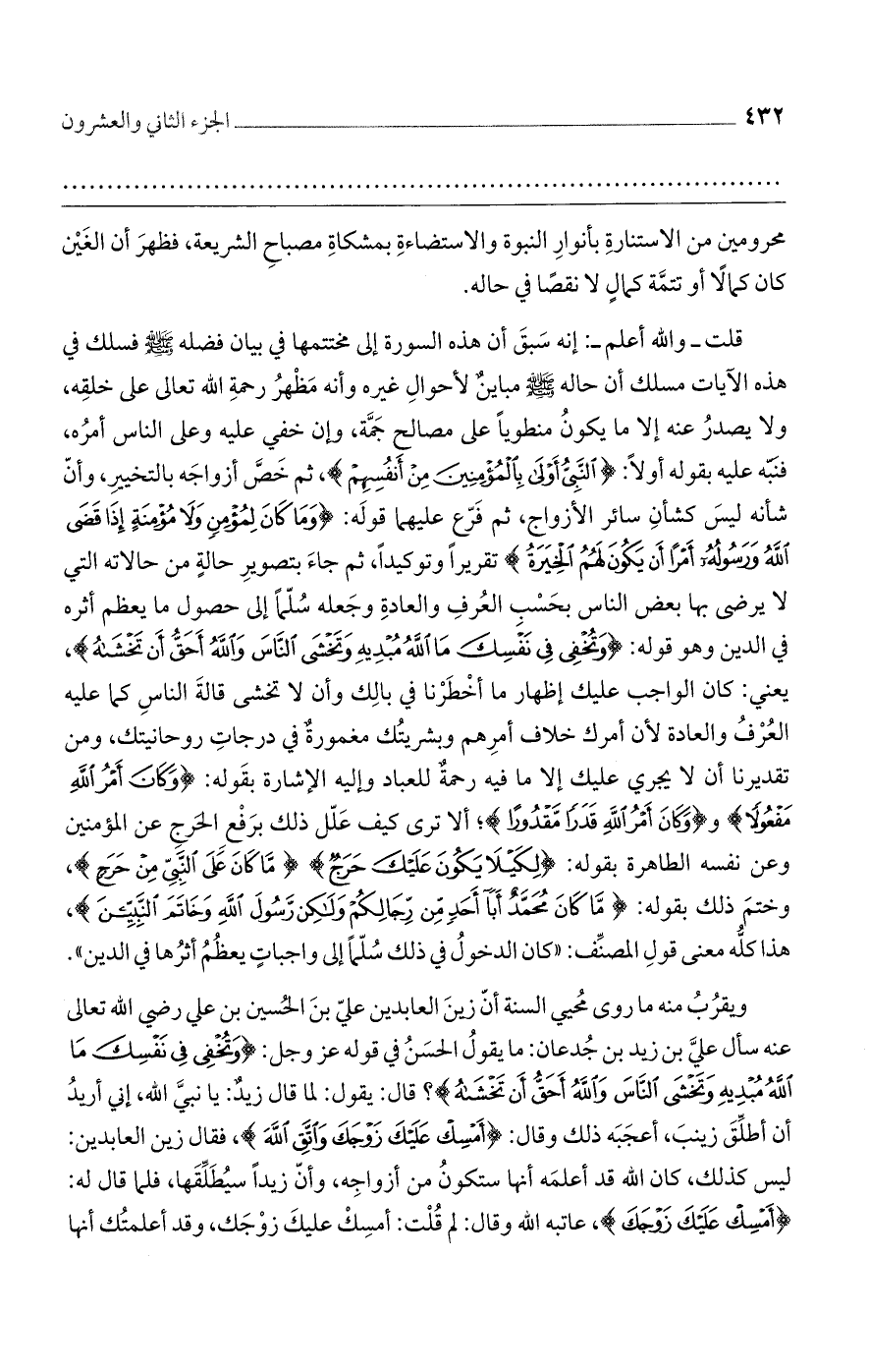 ويقرُبُ منه ما روى مُحيي السنة أنّ زينَ العابدين عليّ بنَ الحُسين بن علي رضي الله تعالى عنه سأل عليَّ بن زيد بن جُدعان: ما يقولُ الحسَنُ في قوله عز وجل: {تُخْفِي فِي نَفْسِكَ مَا اللَّهُ مُبْدِيهِ وَتَخْشَى النَّاسَ وَاللَّهُ أَحَقُّ أَن تَخْشَاهُ}؟ قال: يقول: لما قال زيدٌ: يا نبيَّ الله، إني أريدُ أن أطلِّقَ زينبَ، أعجَبَه ذلك وقال: {أَمْسِكْ عَلَيْكَ زَوْجَكَ وَاتَّقِ اللَّهَ}، فقال زين العابدين: ليس كذلك، كان الله قد أعلمَه أنها ستكونُ من أزواجِه، وأنّ زيدًا سيُطَلِّقَها، فلما قال له: {أَمْسِكْ عَلَيْكَ زَوْجَكَ}، عاتبه الله وقال: لم قُلْت: أمسِكْ عليكَ زوْجَك، وقد أعلمتُك أنها