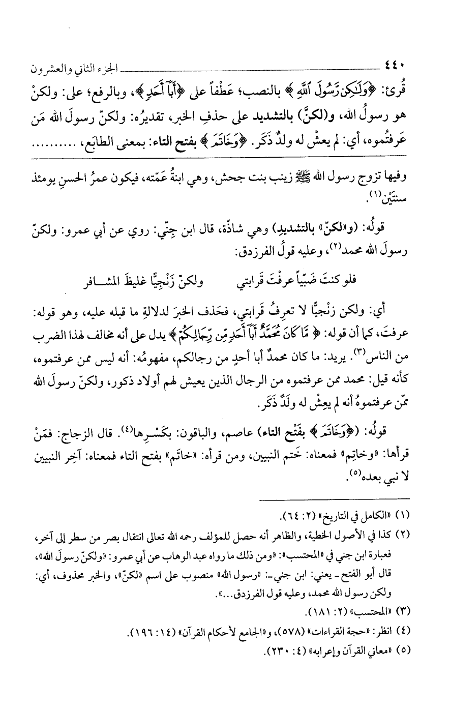 قرئ: (ولكن رسول الله) بالنصب؛ عطفًا على (أَبا أَحَدٍ)، وبالرفع؛ على: ولكن هو رسول الله، و (لكنّ) بالتشديد على حذف الخبر، تقديره: ولكنّ رسول الله من عرفتموه، أى: لم يعش له ولد ذكر. (وخاتم) بفتح التاء: بمعنى الطابع،