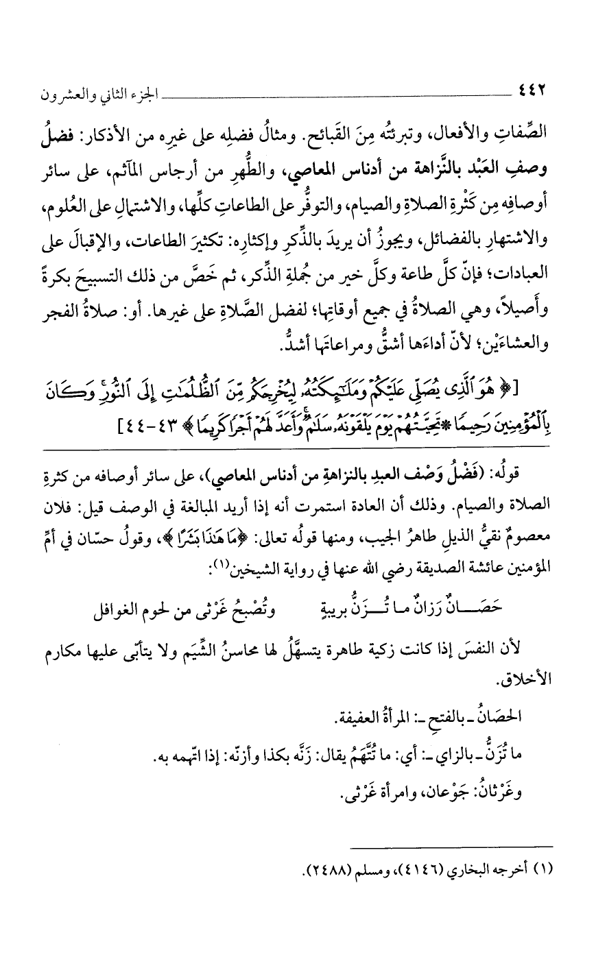 قولُه: (فَضْلُ وَصْف العبدِ بالنزاهةِ من أدناس المعاصي)، على سائر أوصافه من كثرةِ الصلاة والصيام. وذلك أن العادة استمرت أنه إذا أريد المبالغة في الوصف قيل: فلان معصومٌ نقيُّ الذيلِ طاهرُ الجيب، ومنها قولُه تعالى: {مَا هَذَا بَشَرًا}، وقولُ حسّان في أمِّ المؤمنين عائشة الصديقة رضي الله عنها في رواية الشيخين: