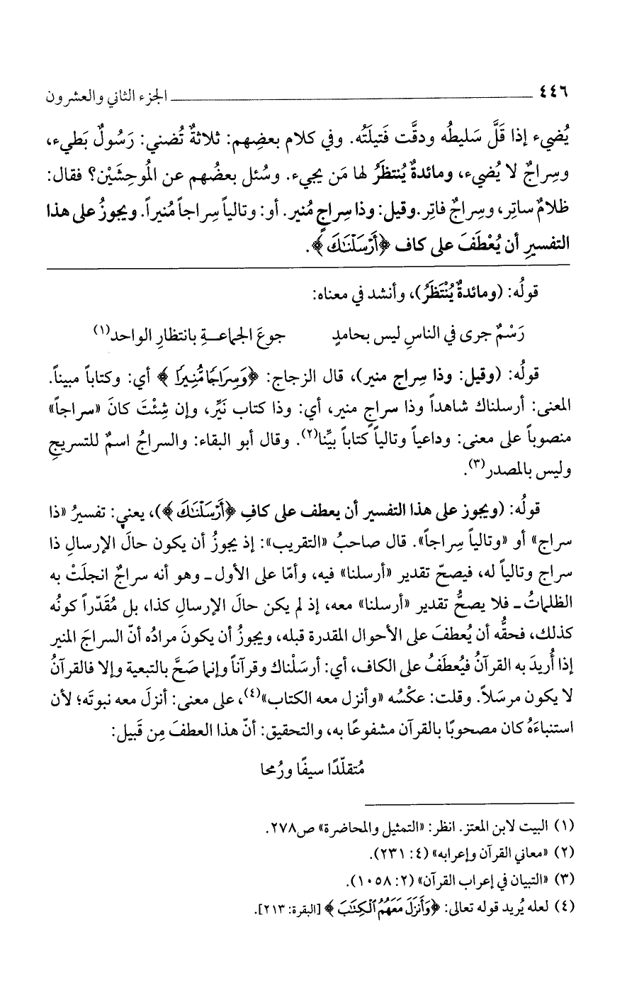 المعنى: أرسلناك شاهدًا وذا سراجٍ منير، أي: وذا كتاب نَيِّر، وإن شِئْتَ كانَ ((سراجًا)) منصوبًا على معنى: وداعيًا وتاليًا كتابًا بيِّنا. وقال أبو البقاء: والسراجُ اسمٌ للتسريجِ وليس بالمصدر.