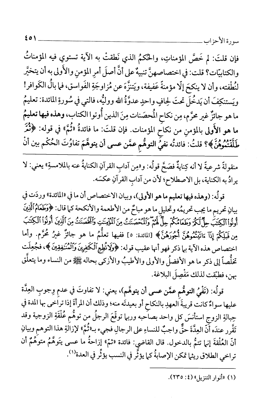 قولُه: (وهذه فيها تعليم ما هو الأولى)، وبيان الاختصاص أن ما في ((المائدة)) وردَت في بيانِ تحريمِ ما يجب تحريمُه وتحليلِ ما هو مباحٌ من الأطعمة والأنكحة كما قال: {وَطَعَامُ الَّذِينَ أُوتُوا الْكِتَابَ حِلٌّ لَّكُمْ وَطَعَامُكُمْ حِلٌّ لَّهُمْ وَالْمُحْصَنَاتُ مِنَ الْمُؤْمِنَاتِ وَالْمُحْصَنَاتُ مِنَ الَّذِينَ أُوتُوا الْكِتَابَ مِن قَبْلِكُمْ إِذَا آتَيْتُمُوهُنَّ أُجُورَهُنَّ} [المائدة: 5] ففيها تعلُّمُ ما هو جائزٌ غيرُ مُحرَّم. وأما اختصاص هذه الآية بما ذكر فهو أنها عقيب قوله: {وَلَا تُطِعِ الْكَافِرِينَ وَالْمُنَافِقِينَ}، فجُعِلَت تخلُّصًا إلى ذكر ما هو الأفضلُ والأولى والأطيبُ والأزكى بحاله صلى الله عليه وسلم من النساء وما يتعلَّق بهن، فطبّقت لذلك مَفْصِلَ البلاغة.