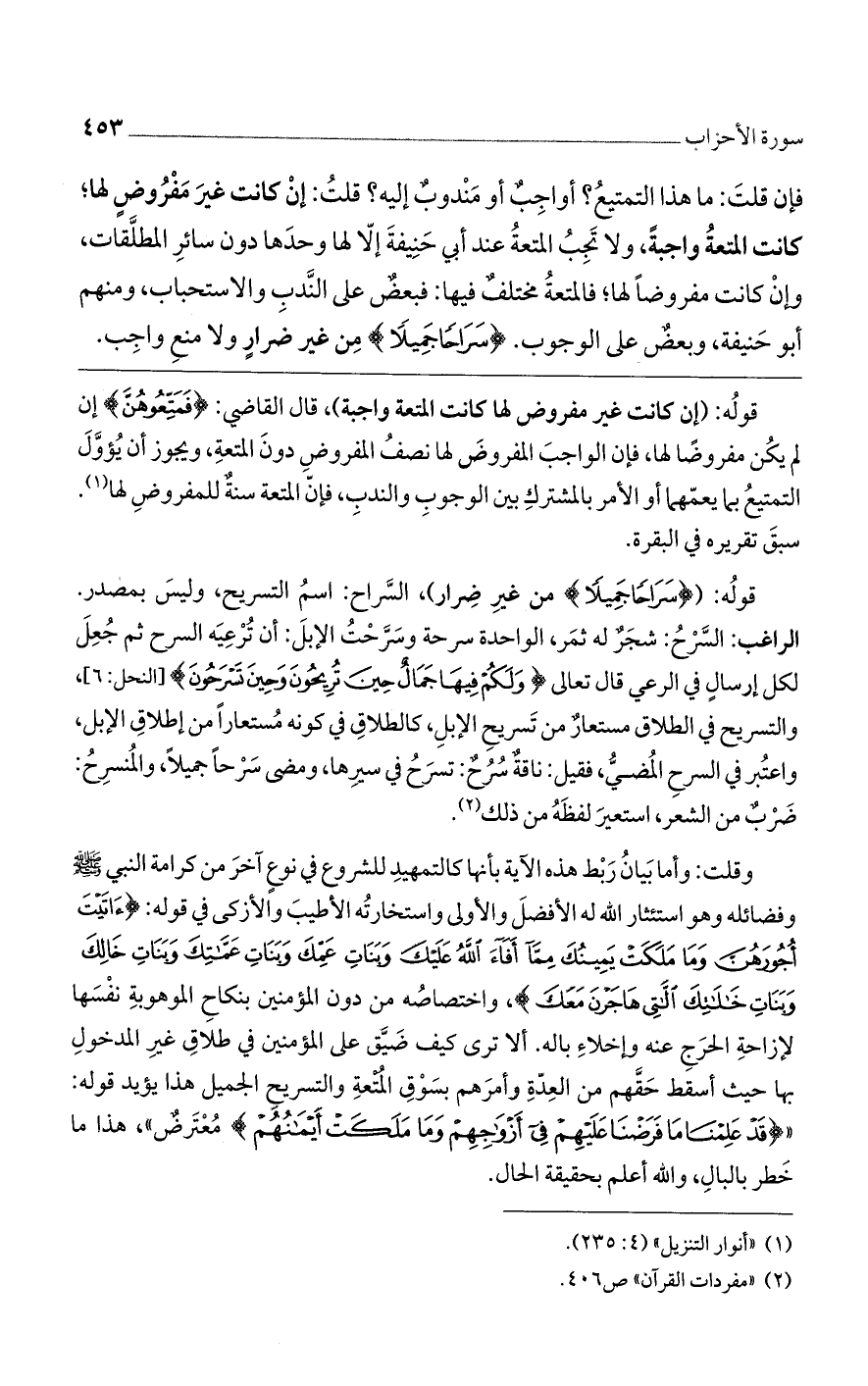 قولُه: ({سَرَاحًا جَمِيلًا} من غيرِ ضِرار)، السَّراح: اسمُ التسريح، وليسَ بمصدر.