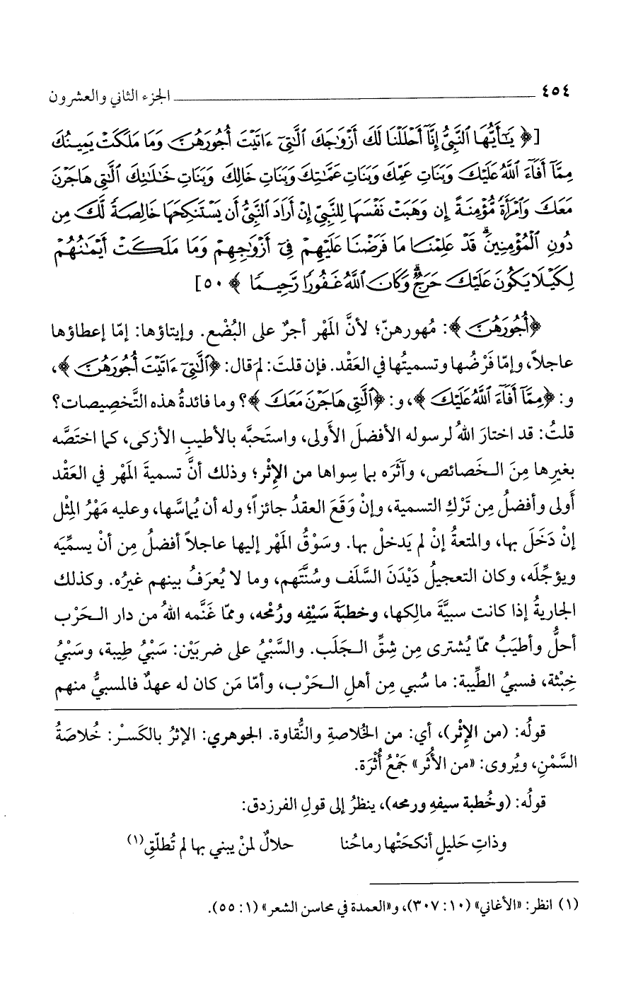 (أُجُورَهُنَّ): مهورهنّ؛ لأنّ المهر أجر على البضع. وإيتاؤها: إما إعطاؤها عاجلًا، وإما فرضها وتسميتها في العقد. فإن قلت: لم قال: (اللَّاتِي آتَيْتَ أُجُورَهُنَّ)، و: (مِمَّا أَفاءَ الله عَلَيْكَ)، و: (اللَّاتِي هاجَرْنَ مَعَكَ)؟ وما فائدة هذه التخصيصات؟ قلت: قد اختار الله لرسوله الأفضل الأولى، واستحبه بالأطيب الأزكى، كما اختصه بغيرها من الخصائص، وآثره بما سواها من الأثر؛ وذلك أنّ تسمية المهر في العقد أولى وأفضل من ترك التسمية، وإن وقع العقد جائزًا؛ وله أن يماسها، وعليه مهر المثل إن دخل بها، والمتعة إن لم يدخل بها. وسوق المهر إليها عاجلًا أفضل من أن يسميه ويؤجله، وكان التعجيل ديدن السلف وسنتهم، وما لا يعرف بينهم غيره. وكذلك الجارية إذا كانت سبية مالكها، وخطبة سيفه ورمحه، ومما غنمه الله من دار الحرب أحل وأطيب مما يشترى من شق الجلب. والسبي على ضربين: سبى طيبة، وسبى خبثة، فسبى الطيبة: ما سبى من أهل الحرب، وأما من كان له عهد فالمسبي منهم