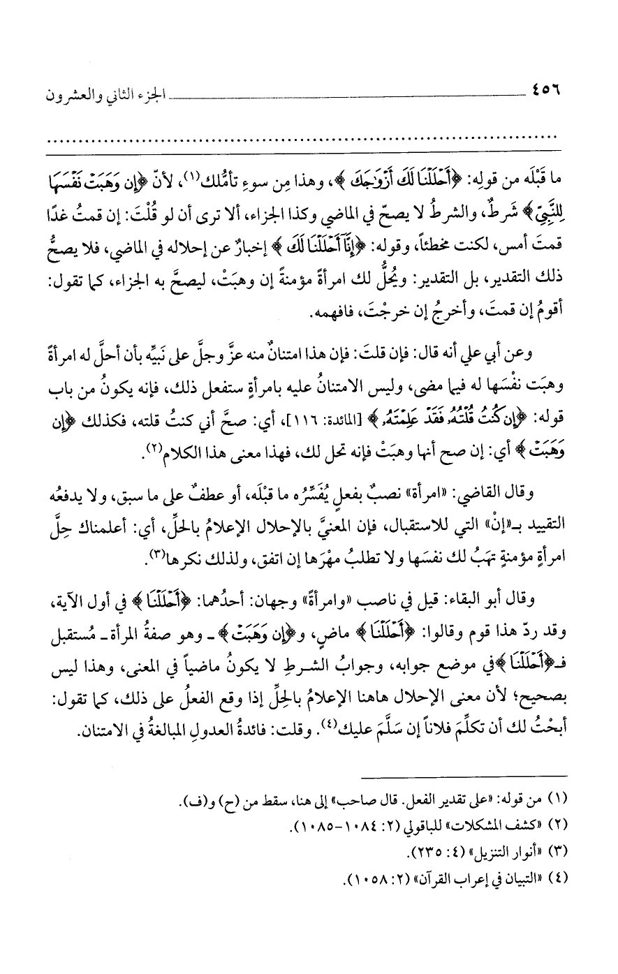 وعن أبي علي أنه قال: فإن قلتَ: فإن هذا امتنانٌ منه عزَّ وجلَّ على نَبيِّه بأن أحلَّ له امرأةً وهبَت نفْسَها له فيما مضى، وليس الامتنانُ عليه بامرأةٍ ستفعل ذلك، فإنه يكونُ من باب قوله: {إِن كُنتُ قُلْتُهُ فَقَدْ عَلِمْتَهُ} [المائدة: 116]، أي: صحَّ أني كنتُ قلته، فكذلك {إِن وَهَبَتْ} أي: إن صح أنها وهبَتْ فإنه تحل لك، فهذا معنى هذا الكلام.