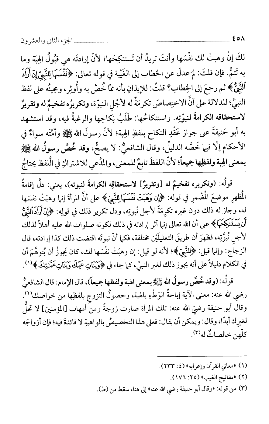 قولُه: (وقد خُصَّ رسولُ الله صلى الله عليه وسلم بمعنى الهبة ولفظها جميعًا)، قال الإمام: قال الشافعيُّ رضي الله عنه: معنى الآية إباحةُ الوَطْءِ بالهبة، وحصولُ التزوجِ بلفظِها من خواصك.