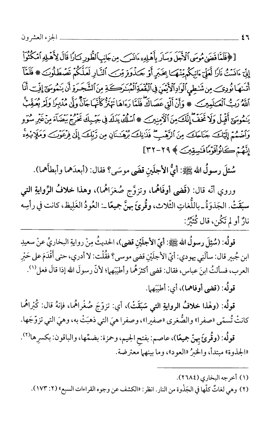 قولُه: (سُئِلَ رسولُ الله صلى الله عليه وسلم: أيّ الأجلَيْنِ قضى)، الحديثُ مِنْ روايةِ البخاريِّ عنْ سعيدِ ابن جُبير قال: سألَنِي يهودي: أيّ الأجلَيْنِ قضى موسى؟ فقُلْت: لا أدري، حتى أَقْدَمَ على حَبْرِ العرب، فسألتُ ابنَ عباس، فقال: قضى أكثَرهُما وأطيَبَهما؛ لأنّ رسولَ الله إذا قالَ فعل.