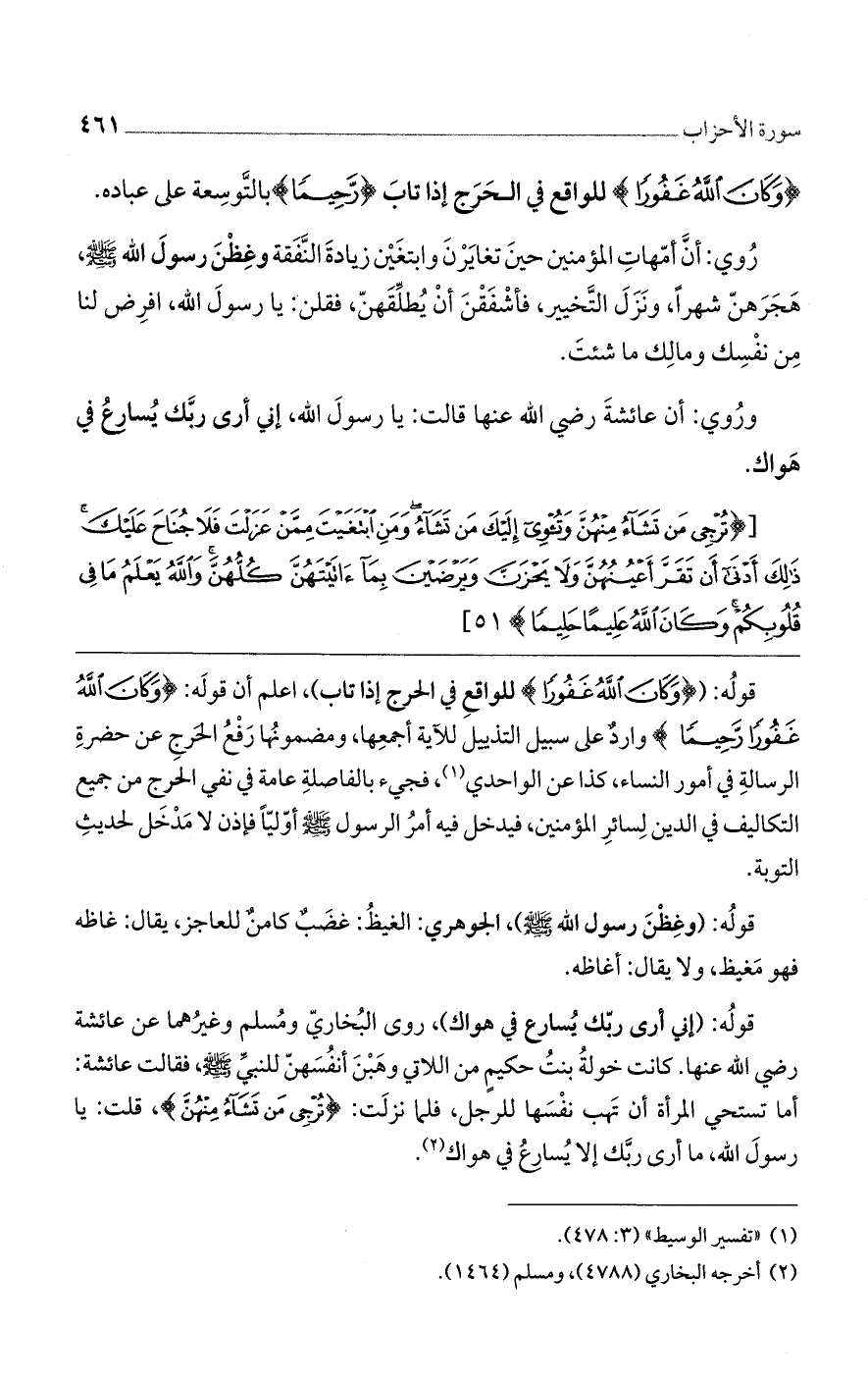 [(تُرْجِي مَن تَشَاءُ مِنْهُنَّ وتُؤْوِي إلَيْكَ مَن تَشَاءُ ومَنِ ابْتَغَيْتَ مِمَّنْ عَزَلْتَ فَلا جُنَاحَ عَلَيْكَ ذَلِكَ أَدْنَى أَن تَقَرَّ أَعْيُنُهُنَّ ولا يَحْزَنَّ ويَرْضَيْنَ بِمَا آتَيْتَهُنَّ كُلُّهُنَّ واللَّهُ يَعْلَمُ مَا فِي قُلُوبِكُمْ وكَانَ اللَّهُ عَلِيمًا حَلِيمًا) [51]