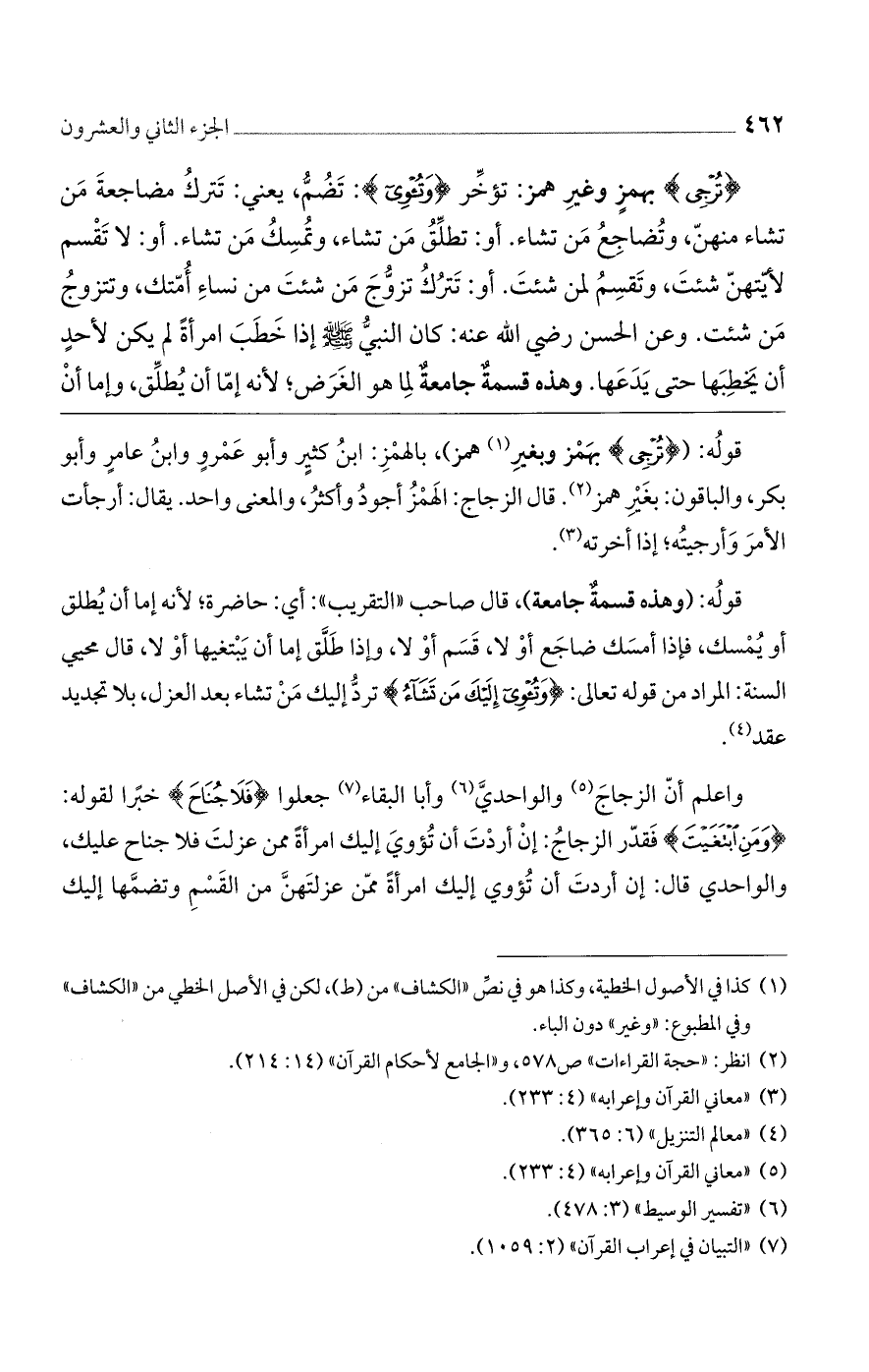 (تُرْجِي) بهمز وغير همز: تؤخر (وَتُؤْوِي): تضمّ، يعنى: تترك مضاجعة من تشاء منهن، وتضاجع من تشاء. أو: تطلق من تشاء، وتمسك من تشاء. أو: لا تقسم لأيتهن، تقسم لمن شئت. أو تترك تزوّج من شئت من نساء أمّتك، وتتزوّج من شئت. وعن الحسن رضى الله عنه: كان النبي صلى الله عليه وسلم إذا خطب امرأة لم يكن لأحد أن يخطبها حتى يدعها. وهذ قسمة جامعة لما هو الغرض؛ لأنه إما أن يطلق، وإما أن