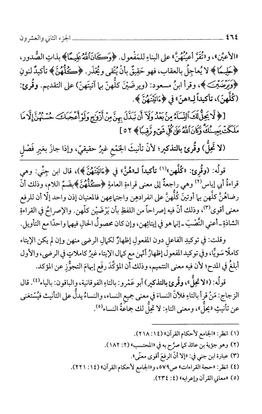 "الأعين"، و"تقرّ أعينهن" على البناء للمفعول. (وَكانَ الله عَلِيماً) بذات الصدور، (حَلِيماً) لا يعاجل بالعقاب، فهو حقيق بأن يتقى ويحذر. (كُلُّهُنَّ) تأكيد لنون (ويرضين)، وقرأ ابن مسعود: (ويرضين كلهن بما آتيتهنّ) على التقديم. وقرئ: (كلهن)، تأكيدًا لـ «هن» في (آتَيْتَهُنَّ).