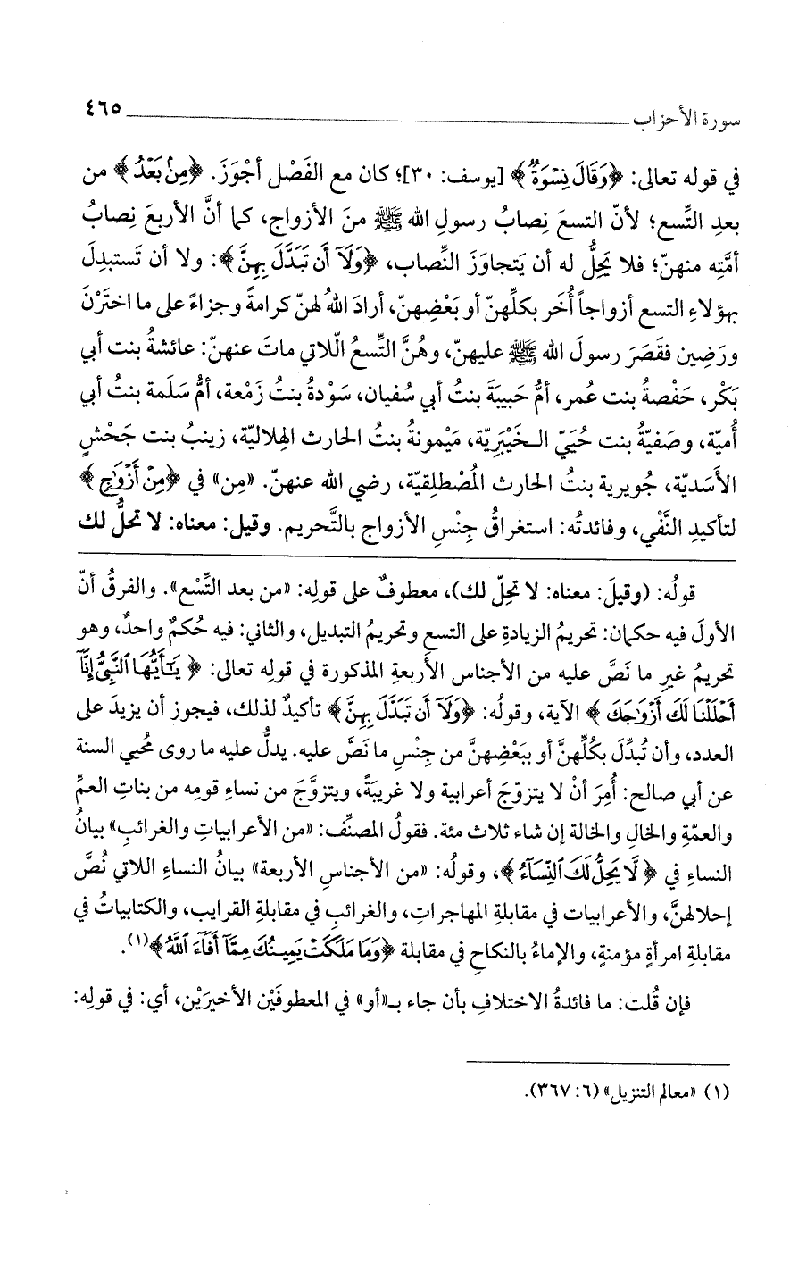 في قوله تعالى: (وَقالَ نِسْوَةٌ)] يوسف: 30 [؛ كان مع الفصل أجوز. (مِنْ بَعْدُ) من بعد التسع؛ لأنّ التسع نصاب رسول الله صلى الله عليه وسلم من الأزواج، كما أن الأربع نصاب أمّته منهنّ؛ فلا يحل له أن يتجاوز النصاب، (وَلا أَنْ تَبَدَّلَ بِهِنَّ): ولا أن تستبدل بهؤلاء التسع أزواجًا أخر بكلهنّ أو بعضهن، أراد الله لهنّ كرامةً وجزاًء على ما اخترن ورضين. فقصر رسول الله صلى الله عليه وسلم عليهنّ، وهي التسع اللاتي مات عنهن: عائشة بنت أبى بكر، حفصة بنت عمر، أمّ حبيبة بنت أبى سفيان، سودة بنت زمعة، أمّ سلمة بنت أبى أمية، صفية بنت حيي الخيبرية، ميمونة بنت الحرث الهلالية، زينب بنت جحش الأسدية، جويرية بنت الحرث المصطلقية، رضى الله عنهن. "من" في (مِنْ أَزْواجٍ) لتأكيد النفي، وفائدته: استغراق جنس الأزواج بالتحريم. وقيل: معناه: لا تحل لك
