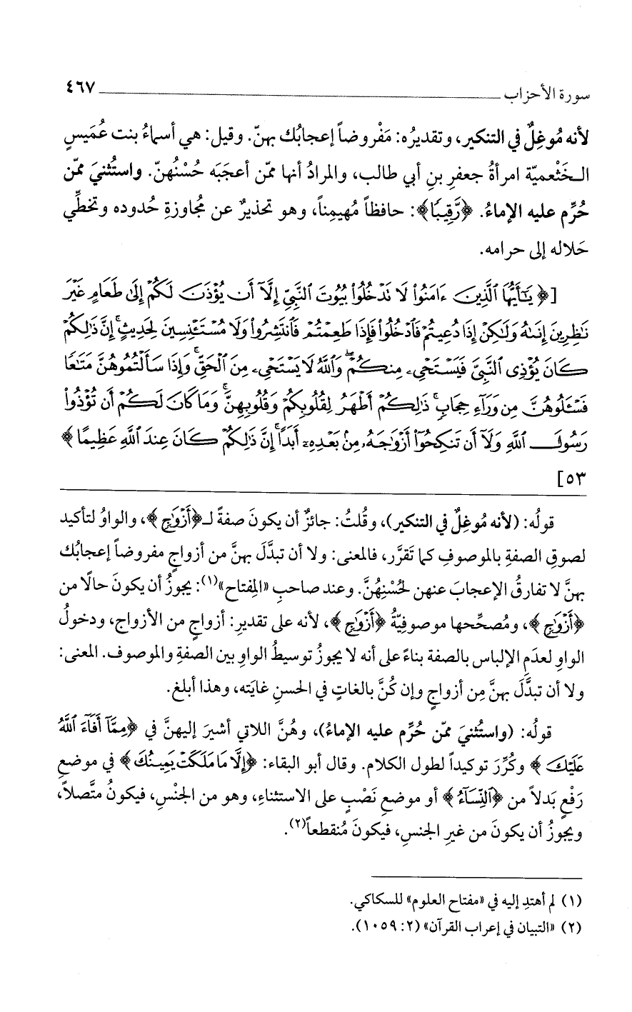 [(يا أَيُّهَا الَّذِينَ آمَنُوا لا تَدْخُلُوا بُيُوتَ النَّبِيِّ إِلاَّ أَنْ يُؤْذَنَ لَكُمْ إِلى طَعامٍ غَيْرَ ناظِرِينَ إِناهُ وَلكِنْ إِذا دُعِيتُمْ فَادْخُلُوا فَإِذا طَعِمْتُمْ فَانْتَشِرُوا وَلا مُسْتَانِسِينَ لِحَدِيثٍ إِنَّ ذلِكُمْ كانَ يُؤْذِي النَّبِيَّ فَيَسْتَحْيِي مِنْكُمْ وَالله لا يَسْتَحْيِي مِنَ الْحَقِّ وَإِذا سَأَلْتُمُوهُنَّ مَتاعاً فَسْئَلُوهُنَّ مِنْ وَراءِ حِجابٍ ذلِكُمْ أَطْهَرُ لِقُلُوبِكُمْ وَقُلُوبِهِنَّ وَما كانَ لَكُمْ أَنْ تُؤْذُوا رَسُولَ الله وَلا أَنْ تَنْكِحُوا أَزْواجَهُ مِنْ بَعْدِهِ أَبَداً إِنَّ ذلِكُمْ كانَ عِنْدَ الله عَظِيماً)] 53 [