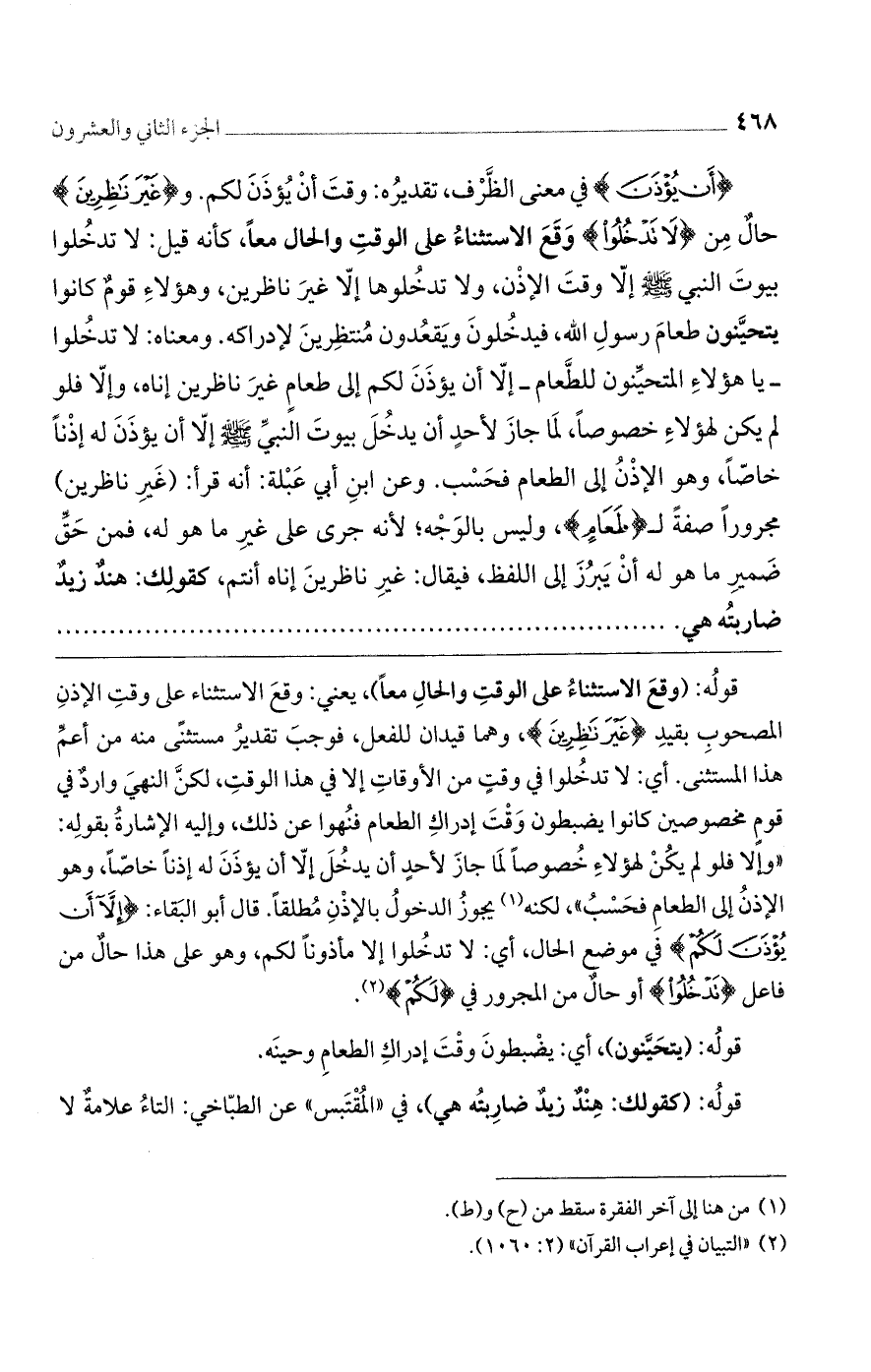 قولُه: (وقعَ الاستثناءُ على الوقتِ والحالِ معًا)، يعني: وقعَ الاستثناء على وقتِ الإذنِ المصحوبِ بقيدِ {غَيْرَ نَاظِرِينَ}، وهما قيدان للفعل، فوجبَ تقديرُ مستثنًى منه من أعمِّ هذا المستثنى. أي: لا تدخُلوا في وقتٍ من الأوقاتِ إلا في هذا الوقتِ، لكنَّ النهيَ واردٌ في قومٍ مخصوصين كانوا يضبطون وَقْتَ إدراكِ الطعام فنُهوا عن ذلك، وإليه الإشارةُ بقولِه: ((وإلا فلو لم يكُنْ لهؤلاءِ خُصوصًا لَما جازَ لأحدٍ أن يدخُلَ إلاّ أن يؤذَنَ له إذنًا خاصًّا، وهو الإذنُ إلى الطعامِ فحَسْبُ))، لكنه يجوزُ الدخولُ بالإذْنِ مُطلقًا. قال أبو البَقاء: {إِلَّا أَن يُؤْذَنَ لَكُمْ} في موضع الحال، أي: لا تدخُلوا إلا مأذونًا لكم، وهو على هذا حالٌ من فاعل {تَدْخُلُوا} أو حالٌ من المجرور في {لَكُمْ}.