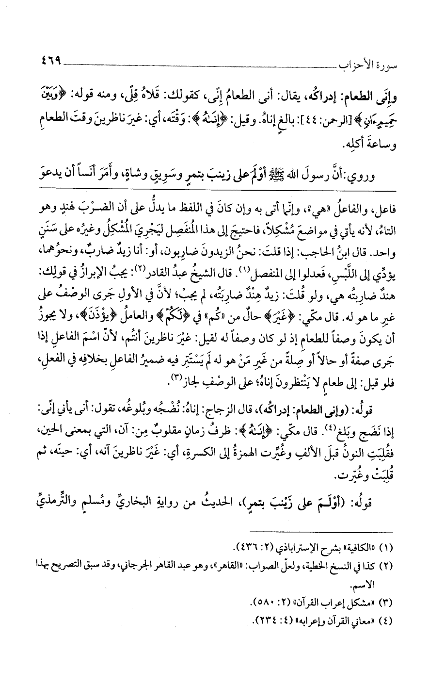 فاعل، والفاعلُ ((هي))، وإنّما أتى به وإن كانَ في اللفظ ما يدلُّ على أن الضرْبَ لهندٍ وهو التاءُ، لأنه يأتي في مواضعَ مَشْكِلاً، فاحتيجَ إلى هذا المُنفَصِل ليَجْرِيَ المُشْكِلُ وغيرُه على سَنَنٍ واحد. قال ابنُ الحاجب: إذا قلتَ: نحنُ الزيدونَ ضارِبون، أو: زيدٌ ضاربٌ، ونحوُهما، يؤدِّي إلى اللَّبْسِ، فَعدلوا إلى المنفصل. قال الشيخُ عبدُ القادر: يجبُ الإبرازُ في قولِك: هندٌ ضارِبتُه هي، ولو قُلتَ: زيدٌ هِنْدٌ ضارِبَتُه، لم يجبْ؛ لأنَّ في الأولِ جَرى الوصْفُ على غيرِ ما هو له. قال مكّي: {غَيْرَ} حالٌ من ((كُم)) في {لَكُمْ} والعاملُ {يؤْذَنَ}، ولا يجوزُ أن يكونَ وصفًا للطعامِ إذ لو كان وصفًا له لقيل: غيْرَ ناظرينَ أنتُم، لأنّ اسْمَ الفاعلِ إذا جَرى صفةً أو حالاً أو صِلةً من غَيرِ مَنْ هو له لَم يَسْتَترِ فيه ضميرُ الفاعلِ بخلافِه في الفعلِ، فلو قيل: إلى طعامٍ لا يَنْتظرونَ إناهُ؛ على الوصْفِ لجاز.