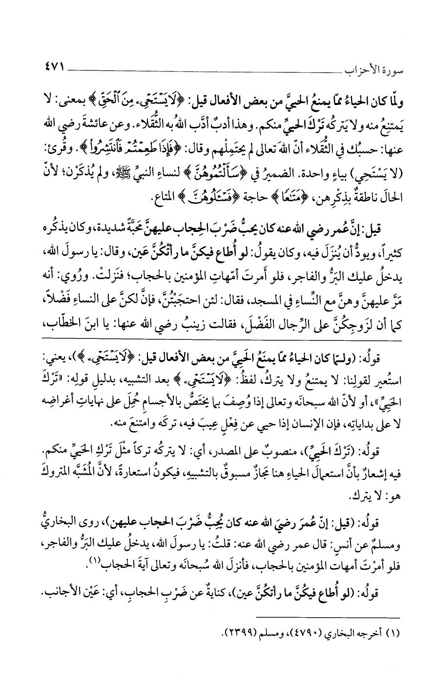 قولُه: (قيل: إنّ عُمرَ رضيَ الله عنه كان يُحِبُّ ضَرْبَ الحجاب عليهن)، روى البخاريُّ ومسلمٌ عن أنسٍ: قال عمر رضي الله عنه: قلتُ: يا رسولَ الله، يدخلُ عليك البَرُّ والفاجر، فلو أمرْتَ أمهات المؤمنين بالحجاب، فأنزلَ الله سُبحانَه وتعالى آيةَ الحجاب.