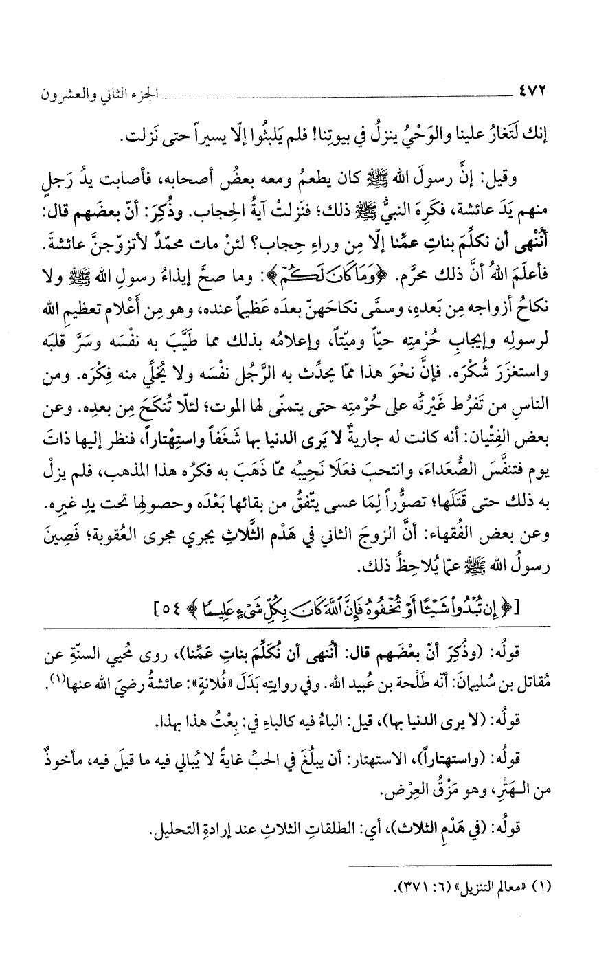 وقيل: إنّ رسول الله صلى الله عليه وسلم كان يطعم ومعه بعض أصحابه، فأصابت يد رجل منهم يد عائشة، فكره النبي صلى الله عليه وسلم ذلك؛ فنزلت آية الحجاب. وذكر: أنّ بعضهم قال: أننهى أن نكلم بنات عمنا إلا من وراء حجاب؟ لئن مات محمد لأتزوجن عائشة. فأعلم الله أن ذلك محرم. (وَما كانَ لَكُمْ): وما صح لكم إيذاء رسول الله صلى الله عليه وسلم ولا نكاح أزواجه من بعده، وسمى نكاحهن بعده عظيما عنده، وهو من أعلام تعظيم الله لرسوله وإيجاب حرمته حيًا وميتًا، وإعلامه بذلك مما طيب به نفسه وسر قلبه واستغزر شكره. فإن نحو هذا مما يحدث الرجل به نفسه ولا يخلى منه فكره. ومن الناس من تفرط غيرته على حرمته حتى يتمنى لها الموت؛ لئلا تنكح من بعده. وعن بعض الفتيان: أنه كانت له جارية لا يرى الدنيا بها شغفًا واستهتارًا، فنظر إليها ذات يوم فتنفس الصعداء، وانتحب فعلا نحيبه مما ذهب به فكره هذا المذهب، فلم يزل به ذلك حتى قتلها؛ تصورًا لما عسى يتفق من بقائها بعده وحصولها تحت يد غيره. وعن بعض الفقهاء: أن الزوج الثاني في هدم الثلاث مما يجرى مجرى العقوبة؛ فصين رسول الله صلى الله عليه وسلم عما يلاحظ ذلك.