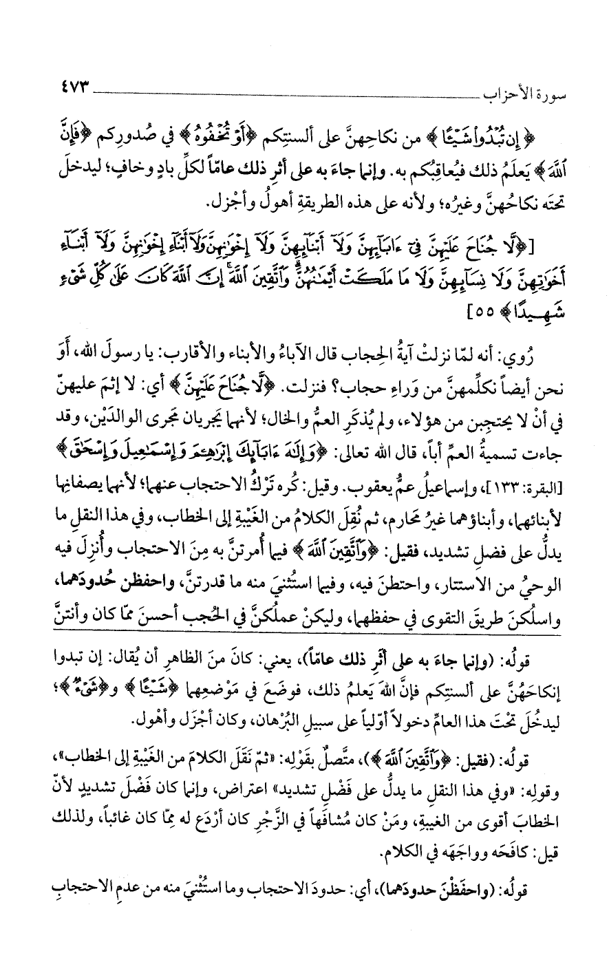 [(لا جُناحَ عَلَيْهِنَّ فِي آبائِهِنَّ وَلا أَبْنائِهِنَّ وَلا إِخْوانِهِنَّ وَلا أَبْناءِ إِخْوانِهِنَّ وَلا أَبْناءِ أَخَواتِهِنَّ وَلا نِسائِهِنَّ وَلا ما مَلَكَتْ أَيْمانُهُنَّ وَاتَّقِينَ الله إِنَّ الله كانَ عَلى كُلِّ شَيْءٍ شَهِيداً)] 55 [