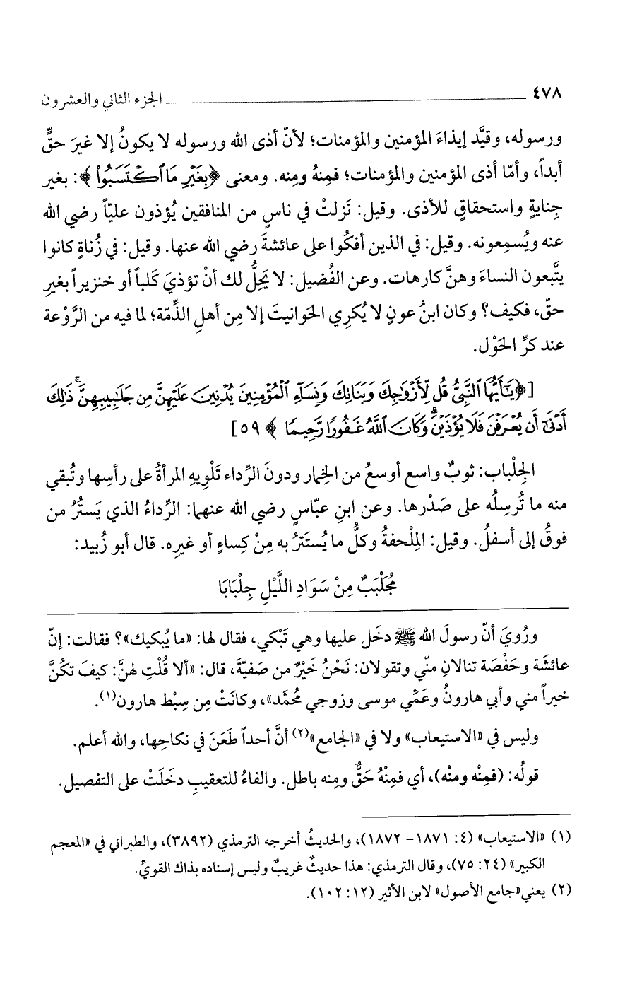 [(يا أَيُّهَا النَّبِيُّ قُلْ لِأَزْواجِكَ وَبَناتِكَ وَنِساءِ الْمُؤْمِنِينَ يُدْنِينَ عَلَيْهِنَّ مِنْ جَلابِيبِهِنَّ ذلِكَ أَدْنى أَنْ يُعْرَفْنَ فَلا يُؤْذَيْنَ وَكانَ الله غَفُوراً رَحِيماً)] 59 [