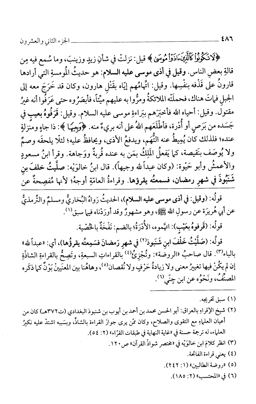 قولُه: (صَلَّيْتُ خَلْفَ ابنِ شَنَبوذ في شهرِ رَمضانَ فسَمِعتُه يقرؤُها)، أي: ((عبدًا لله)) بالباء. قال صاحبُ ((الروضة)): وتُجْزِئُ بالقراءاتِ السبعةِ، وتَصِحُّ بالقراءةِ الشاذّةِ إن لم يكُنْ فيها تغييرُ معنى ولا زيادةُ حَرْفٍ ولا نُقصان، وهاهُنا بين المعنَيينْ بَوْنٌ كما ذكَره المصنِّفُ، ونَحْوُه عن ابن جِنّي.