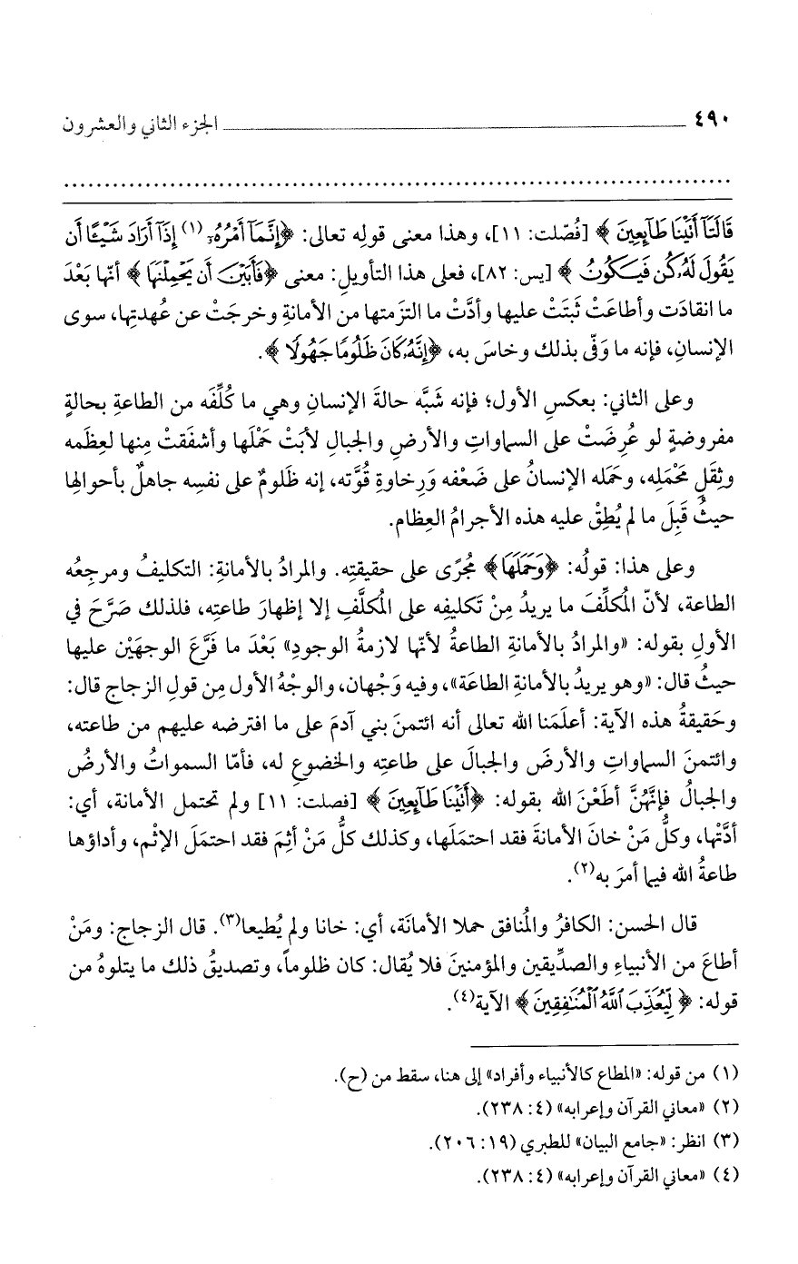 قَالَتَا أَتَيْنَا طَائِعِينَ} [فُصّلت: 11]، وهذا معنى قولِه تعالى: {إِنَّمَا أَمْرُهُ إِذَا أَرَادَ شَيْئًا أَن يَقُولَ لَهُ كُن فَيَكُونُ} [يس: 82]، فعلى هذا التأويلِ: معنى {فَأَبَيْنَ أَن يَحْمِلْنَهَا} أنّها بَعْدَ ما انقادَت وأطاعَتْ ثَبتَتْ عليها وأدَّتْ ما التزَمتها من الأمانةِ وخرجَتْ عن عُهدتِها، سوى الإنسانِ، فإنه ما وَفّى بذلك وخاسَ به، {إِنَّهُ كَانَ ظَلُومًا جَهُولًا}.