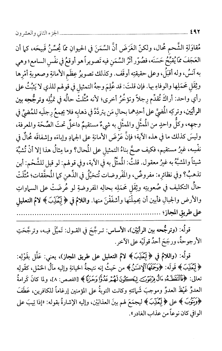 مقاولة الشحم محال، ولكن الغرض أنّ السمن في الحيوان مما يحسن قبيحه، كما أن العجف مما يقبح حسنه، فصوّر أثر السمن فيه تصويرًا هو أوقع في نفس السامع؛ وهي به آنس، وله أقبل، وعلى حقيقته أوقف. وكذلك تصوير عظم الأمانة وصعوبة أمرها وثقل محملها والوفاء بها. فإن قلت: قد علم وجه التمثيل في قولهم للذي لا يثبت على رأى واحد: أراك تقدم رجلًا وتؤخر أخرى؛ لأنه مثلت حاله في تميله وترجحه بين الرأيين، وتركه المضي على أحدهما بحال من يتردد في ذهابه فلا يجمع رجليه للمضى في وجهه، وكل واحٍد من الممثل والممثل به شيء مستقيم داخل تحت الصحة والمعرفة، وليس كذلك ما في هذه الآية؛ فإن عرض الأمانة على الجماد وإباءه وإشفاقه محال في نفسه، غير مستقيم، فكيف صح بناء التمثيل على المحال؟ وما مثال هذا إلا أن تشبه شيئًا والمشبه به غير معقول. قلت: الممثل به في الآية، وفي قولهم: لو قيل للشحم: أين تذهب؟ وفي نظائره: مفروض، والمفروضات تتخيل في الذهن كما المحققات؛ مثلت حال التكليف في صعوبته وثقل محمله بحاله المفروضة لو عرضت على السماوات والأرض والجبال فأبين أن يحملنها وأشفقن منها. واللام في (لِيُعَذِّبَ) لام التعليل على طريق المجاز؛