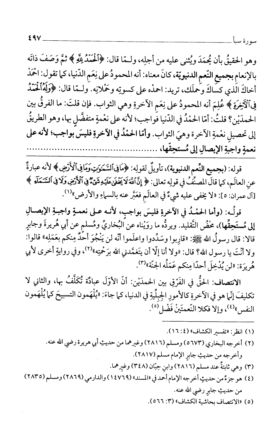 قولُه: (وأما الحمْدُ في الآخرةِ فليسَ بواجبٍ، لأنه على نعمةٍ واجبةِ الإيصالِ إلى مُستَحِقِّها)، محْضُ التَّقليد. ويردُّه ما روَيْناه عن البُخاريِّ ومُسلمٍ عن أبي هُريرةَ وجابرٍ قالا: قال رسولُ الله صلى الله عليه وسلم: ((قارِبوا وسَدِّدوا واعلَموا أنّه لن يَنْجُوَ أحَدٌ مِنكم بعَمَلِه)) قالوا: ولا أنْتَ يا رسول الله؟ قال: ((ولا أنا إلاّ أن يتَغمَّدني الله برَحْمتِه))، وفي روايةٍ أخرى لأبي هُريرَة: ((لن يُدْخِلَ أحدًا مِنكم عَمَلُه الجنّة)).