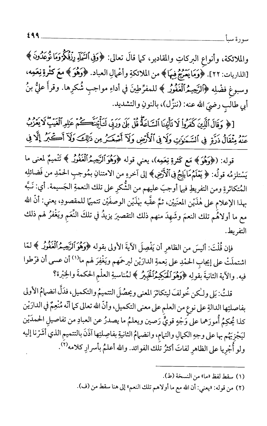 قوله: ({وَهُوَ} مَع كَثرةِ نِعَمِه)، يعني قوله {وَهُوَ الرَّحِيمُ الْغَفُورُ} تَتْميمٌ لمعنى ما يَسْتلزمُه قولُه: {يَعْلَمُ مَا يَلِجُ فِي الْأَرْضِ} إلى آخرهِ من الامتنانِ بمُوجبِ الحمْدِ من فَضائِله المُتكاثرةِ ومن التفريطِ فيما أوجبَ عليهم من الشُّكرِ على تلك النعمةِ الجَسيمة. أي: نَبَّه بهذا الإعلامِ على هَاذَيْن المعنَييْن، ثمَّ عقَّبه بهاذَيْن الوصفَيْن تتميمًا للمقصودِ، يعني: أنّ الله مع ما أولاهُم تلك النعمَ وشَهِدَ منهم ذلك التقصيرَ يزيدُ في تلكَ النِّعَمِ ويَغْفرُ لهم ذلك التفريط.