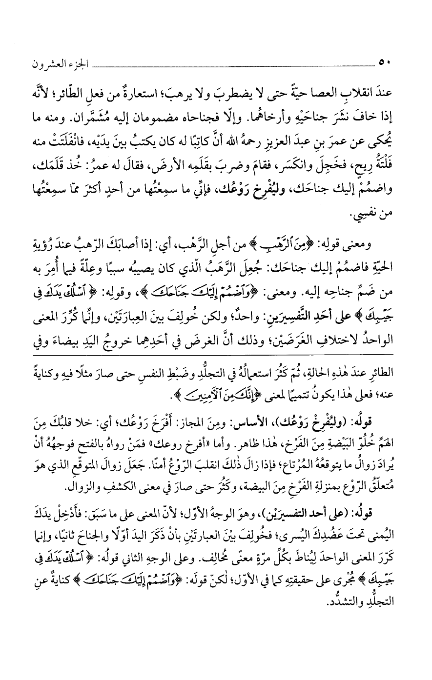 ومعنى قولِه: {مِنَ اَلْرَّهْبِ} من أجلِ الرَّهْب، أي: إذا أصابَكَ الرّهبُ عندَ رُؤيةِ الحيّةِ فاضمُمْ إليك جناحَك: جُعِلَ الرَّهَبُ الّذي كان يصيبُه سببًا وعِلّةً فيما أُمِرَ به من ضَمِّ جناحِه إليه. ومعنى: {وَاضْمُمْ إِلَيْكَ جَنَاحَكَ}، وقولِه: {أسْلُكْ يَدَكَ فِي جَيْبِكَ} على أحَدِ التَّفسِيرَينِ: واحدٌ؛ ولكن خُولِفَ بينَ العِبارَتَيْن، وإنِّما كُرِّرَ المعنى الواحدُ لاختلافِ الغَرَضَيْن؛ وذلك أنَّ الغرضَ في أحَدِهِما خروجُ اليَدِ بيضاءَ وفي