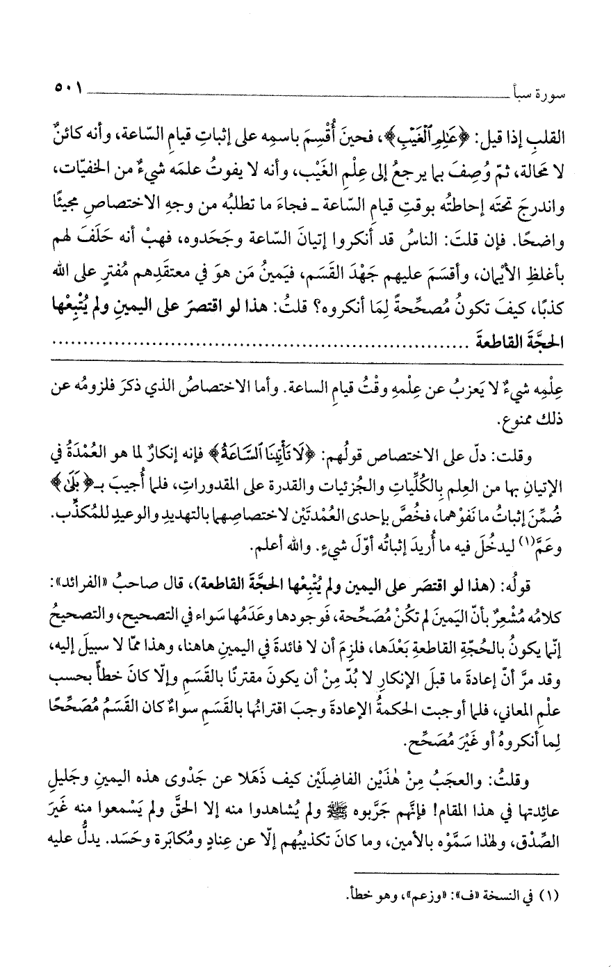 قولُه: (هذا لو اقتصَر على اليمين ولم يُتبِعْها الحجَّةَ القاطعة)، قال صاحبُ ((الفرائد)): كلامُه مُشْعِرٌ بأنّ اليَمينَ لم تكُنْ مُصَحِّحة، فَوجودها وعَدَمُها سَواء في التصحيح، والتصحيحُ إنّما يكونُ بالحُجّةِ القاطعةِ بَعْدَها، فلزِمَ أن لا فائدةَ في اليمينِ هاهنا، وهذا ممّا لا سبيلَ إليه، وقد مرَّ إعادةَ ما قبلَ الإنكارِ لابُدّ مِنْ أن يكونَ مقترنًا بالقَسَمِ وإلاّ كانَ خطأٌ بحسب علْمِ المعاني، فلما أوجبت الحكمةُ الإعادةَ وجبَ اقترانُها بالقَسَمِ سواءٌ كان القَسَمُ مُصَحِّحًا لِما أنكروهُ أو غَيْرَ مُصَحِّح.