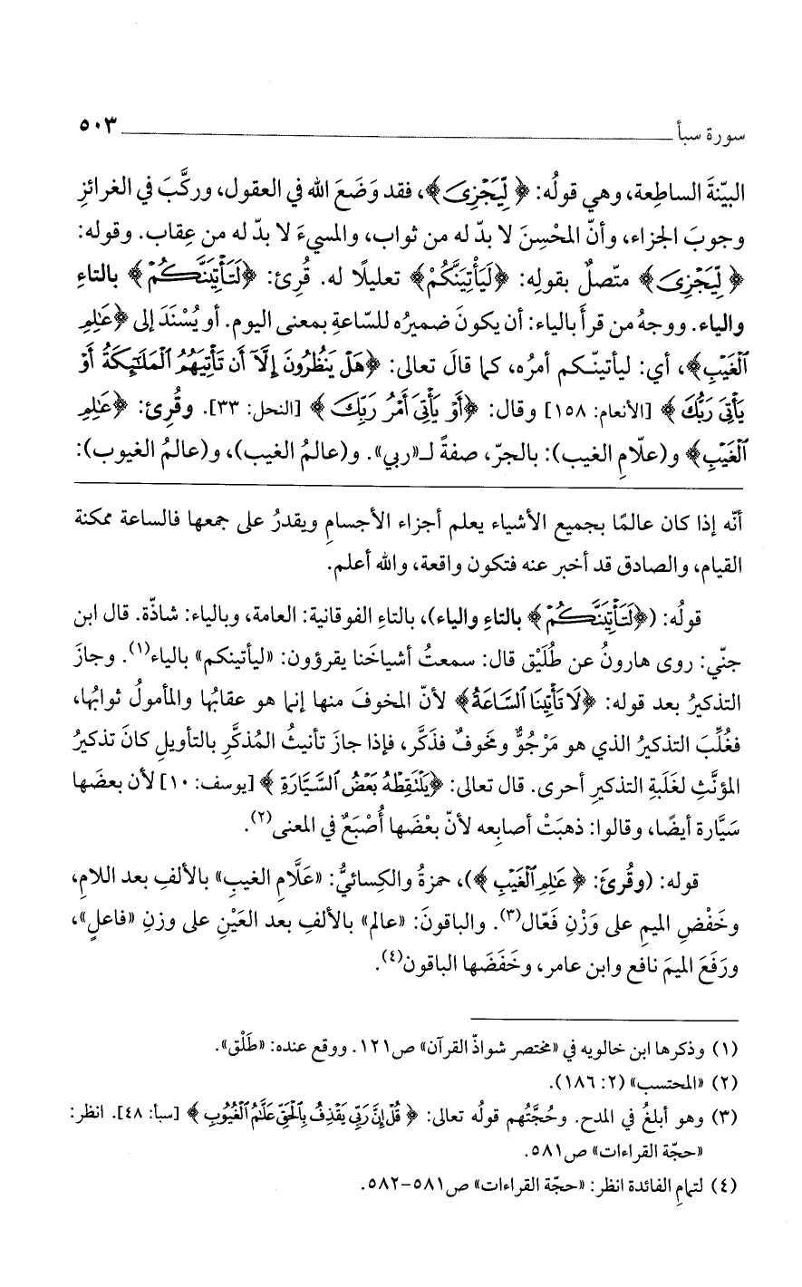 قولُه: ({لَتَاتِيَنَّكُمْ} بالتاءِ والياء)، بالتاءِ الفوقانية: العامة، وبالياء: شاذّة. قال ابن جنّي: روى هارونُ عن طُلَيْق قال: سمعتُ أشياخَنا يقرؤون: ((ليأتينكم)) بالياء. وجازَ التذكيرُ بعد قوله: {لَا تَاتِينَا السَّاعَةُ} لأنّ المخوفَ منها إنما هو عقابُها والمأمولُ ثوابُها، فغُلِّبَ التذكيرُ الذي هو مَرْجُوٌّ ومَخوفٌ فذَكَّر، فإذا جازَ تأنيثُ المُذكَّرِ بالتأويلِ كانَ تذكيرُ المؤنَّثِ لغَلَبةِ التذكيرِ أحرى. قال تعالى: {يَلْتَقِطْهُ بَعْضُ السَّيَّارَةِ} [يوسف: 10] لأن بعضَها سَيَّارة أيضًا، وقالوا: ذهبَتْ أصابِعه لأنّ بعْضَها أُصْبَعٌ في المعنى.