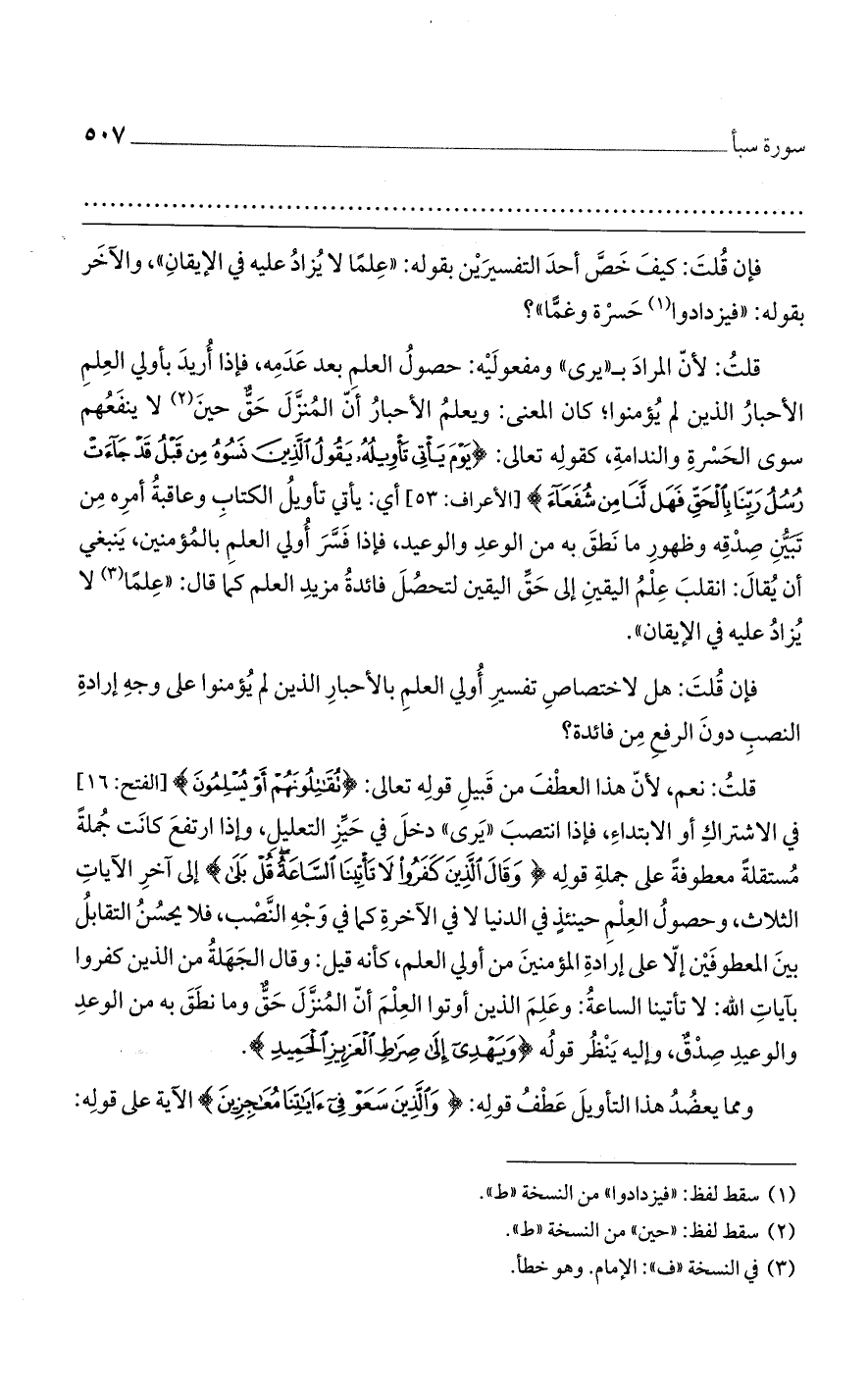 قلتُ: لأنّ المرادَ بـ ((يرى)) ومفعولَيْه: حصولُ العلمِ بعد عَدَمِه، فإذا أًريدَ بأولي العِلمِ الأحبارُ الذين لم يُؤمنوا؛ كان المعنى: ويعلمُ الأحبارُ أنّ المُنزَّلَ حقٌّ حينَ لا ينفَعُهم سوى الحَسْرةِ والندامةِ، كقولِه تعالى: {يَوْمَ يَاتِي تَاوِيلُهُ يَقُولُ الَّذِينَ نَسُوهُ مِن قَبْلُ قَدْ جَاءَتْ رُسُلُ رَبِّنَا بِالْحَقِّ فَهَل لَّنَا مِن شُفَعَاءَ} [الأعراف: 53] أي: يأتي تأويلُ الكتابِ وعاقبةُ أمرِه مِن تَبَيُّنِ صِدْقِه وظهورِ ما نَطقَ به من الوعدِ والوعيد، فإذا فَسَّرَ أُولي العلمِ بالمُؤمنين، يَنبغي أن يُقالَ: انقلبَ عِلْمُ اليقينِ إلى حَقِّ اليقين لحصُلَ فائدةُ مزيدِ العلم كما قال: ((عِلمًا لا يُزادُ عليه في الإيقان)).