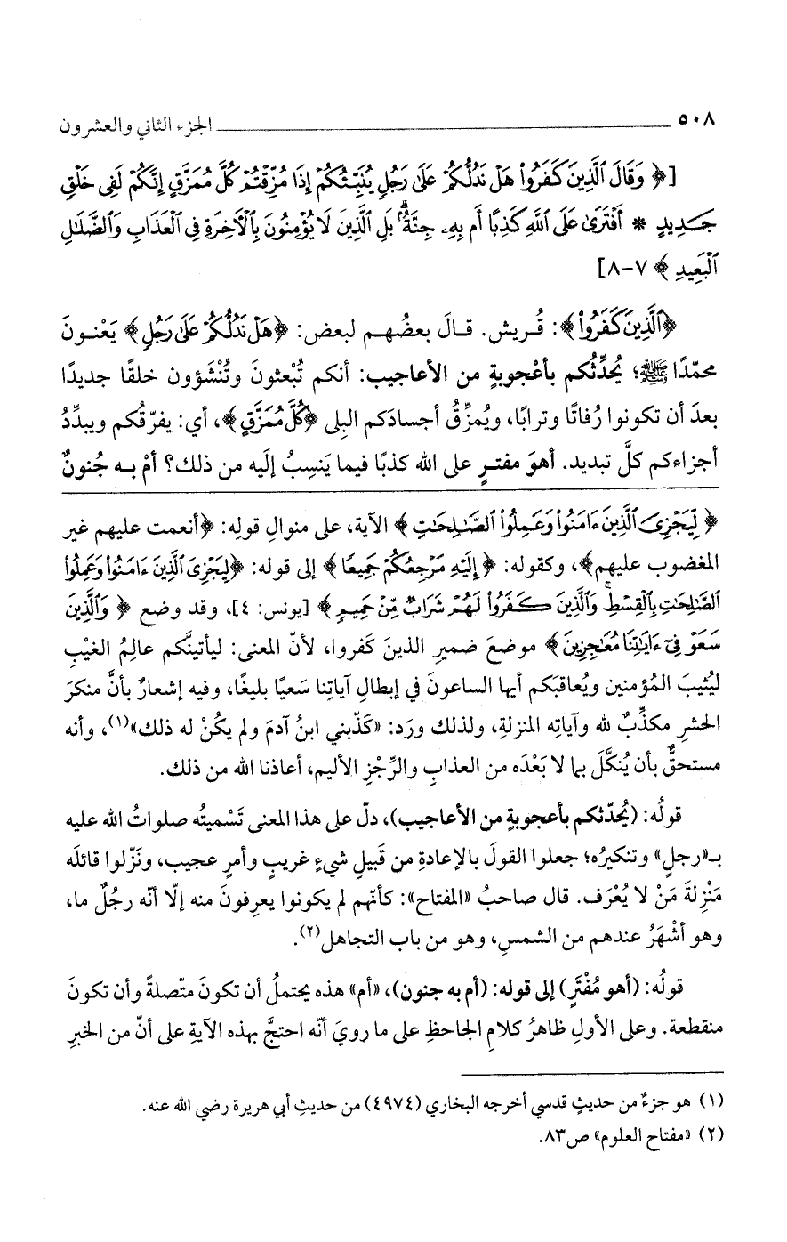 [وَقالَ الَّذِينَ كَفَرُوا هَلْ نَدُلُّكُمْ عَلى رَجُلٍ يُنَبِّئُكُمْ إِذا مُزِّقْتُمْ كُلَّ مُمَزَّقٍ إِنَّكُمْ لَفِي خَلْقٍ جَدِيدٍ (7) أَفْتَرى عَلَى الله كَذِباً أَمْ بِهِ جِنَّةٌ بَلِ الَّذِينَ لا يُؤْمِنُونَ بِالْآخِرَةِ فِي الْعَذابِ وَالضَّلالِ الْبَعِيدِ)] 7 - 8 [