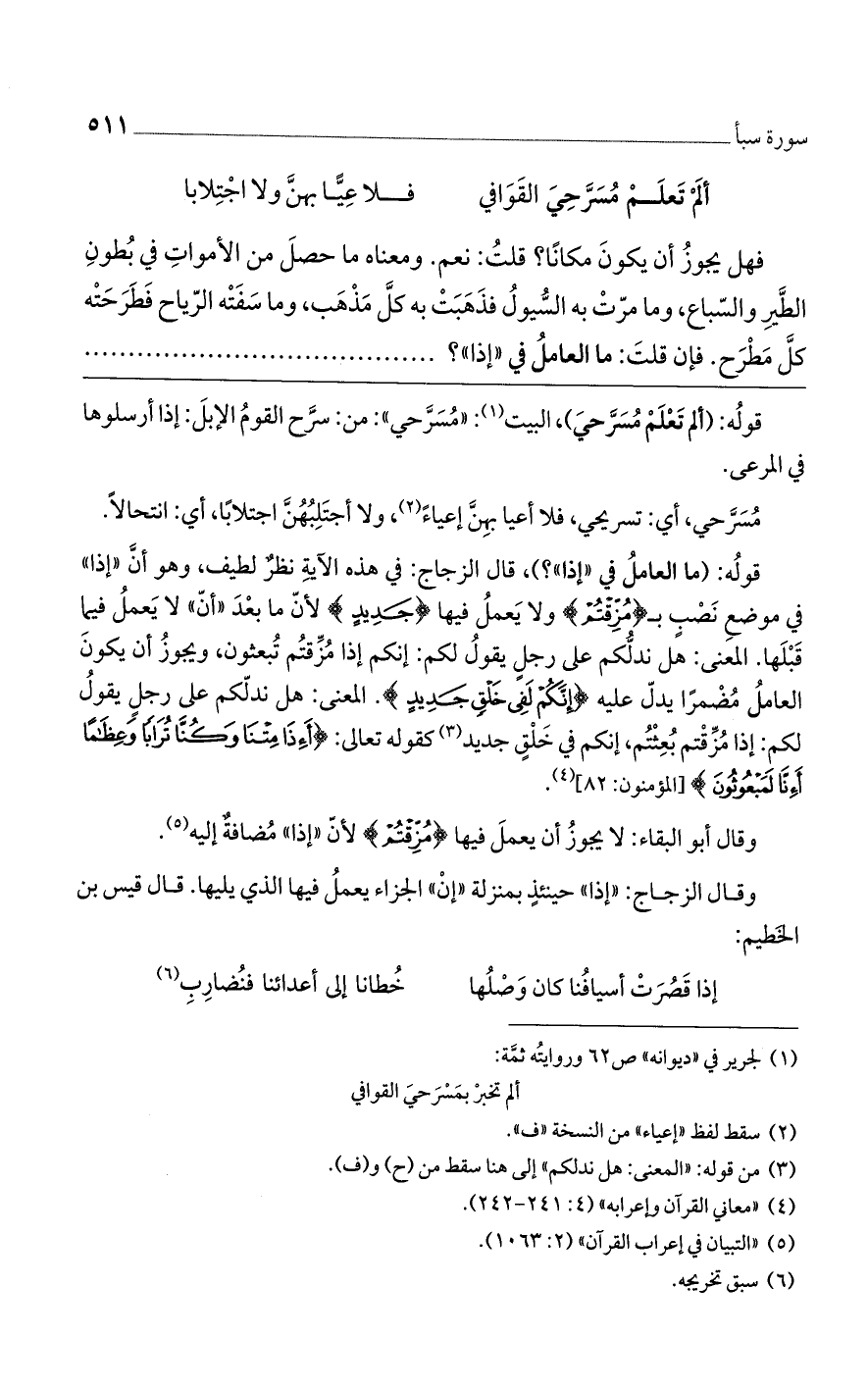 قولُه: (ما العاملُ في ((إذا))؟ )، قال الزجاج: في هذه الآيةِ نظرٌ لطيف، وهو أنَّ ((إذا)) في موضعِ نَصْبٍ بـ {مُزِّقْتُمْ} ولا يَعملُ فيها {جَدِيدٍ} لأنّ ما بعْدَ ((أنّ)) لأنّ ما بعْدَ ((أنّ)) لا يَعملُ فيما قَبْلَها. المعنى: هل ندلُّكم على رجلٍ يقولُ لكم: إنكم إذا مُزِّقتُم تُبعثون، ويجوزُ أن يكونَ العاملُ مُضمرًا يدلّ عليه {إِنَّكُمْ لَفِي خَلْقٍ جَدِيدٍ}. المعنى: هل ندلّكم على رجلٍ يقولُ لكم: إذا مُزِّقْتم بُعِثْتُم، إنكم في خَلْقٍ جديد كقوله تعالى: {أَإِذَا مِتْنَا وَكُنَّا تُرَابًا وَعِظَامًا أَإِنَّا لَمَبْعُوثُونَ} [المؤمنون: 82].