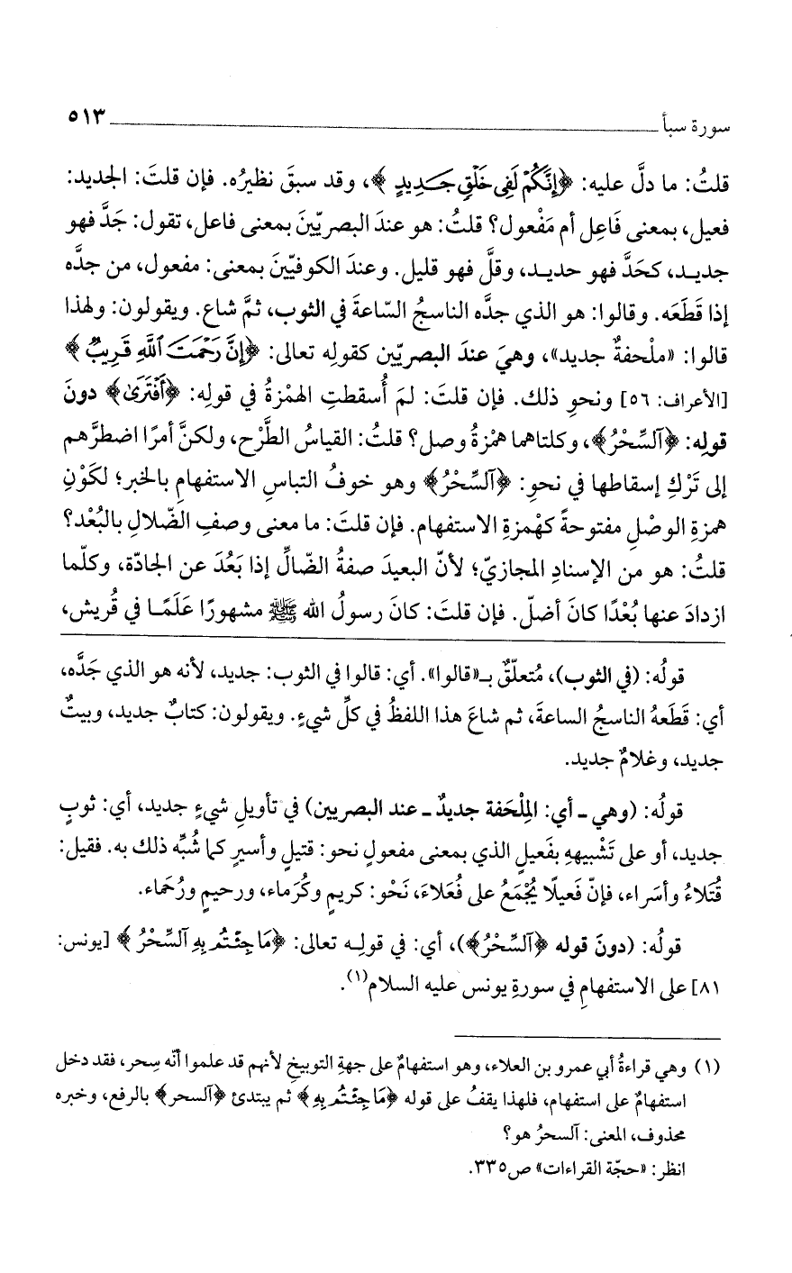 قلت: ما دلّ عليه: (إِنَّكُمْ لَفِي خَلْقٍ جَدِيدٍ)، وقد سبق نظيره. فإن قلت: الجديد: فعيل، بمعنى فاعل أم مفعول؟ قلت: هو عند البصريين بمعنى فاعل، تقول: جد فهو جديد، كحد فهو حديد، وقلّ فهو قليل. وعند الكوفيين بمعنى: مفعول، من جده إذا قطعه. وقالوا: هو الذي جده الناسج الساعة في الثوب، ثم شاع. ويقولون: ولهذا قالوا: "ملحفة جديد"، وهي عند البصريين كقوله تعالى: (إِنَّ رَحْمَتَ الله قَرِيبٌ)] الأعراف: 56 [ونحو ذلك. فإن قلت: لم أسقطت الهمزة في قوله: (أَفْتَرى) دون قوله: (السحر)، وكلتاهما همزة وصل؟ قلت: القياس الطرح، ولكن أمرا اضطرّهم إلى ترك إسقاطها في نحو: (السحر) وهو خوف التباس الاستفهام بالخبر؛ لكون همزة الوصل مفتوحة كهمزة الاستفهام. فإن قلت: ما معنى وصف الضلال بالبعد؟ قلت: هو من الإسناد المجازى؛ لأنّ البعيد صفة الضال إذا بعد عن الجادّة، وكلما ازداد عنها بعدًا كان أضل. فإن قلت: كان رسول الله صلى الله عليه وسلم مشهورًا علمًا في قريش،